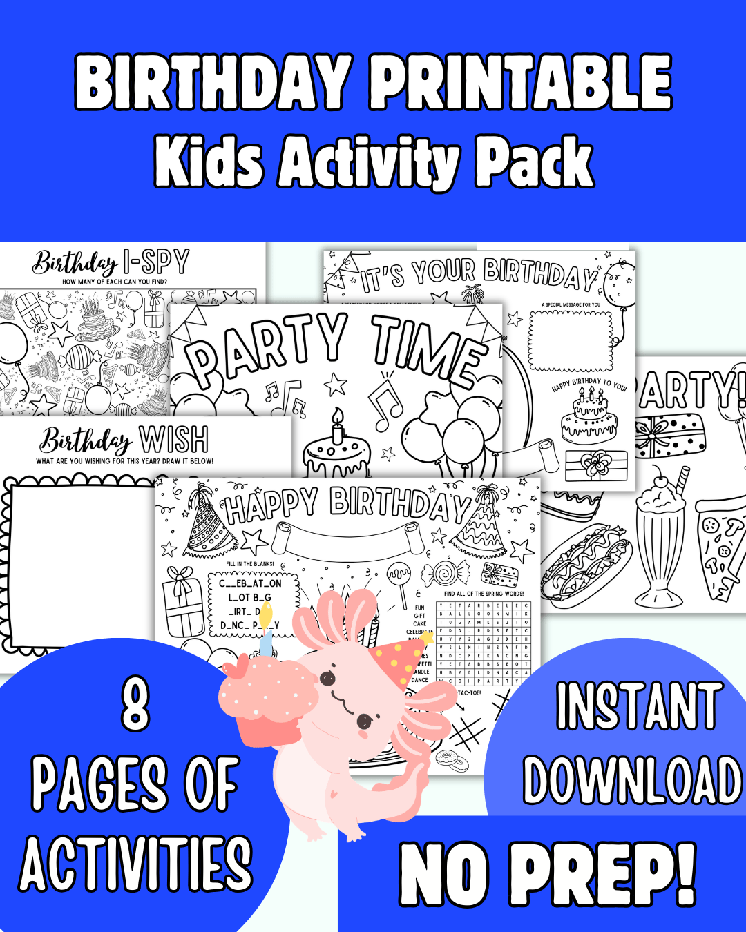 Please note that this printable birthday activity bundle for kids is an instant download non-editable PDF file, designed to be printed as-is. You cannot edit this design. No physical item will be shipped to you.