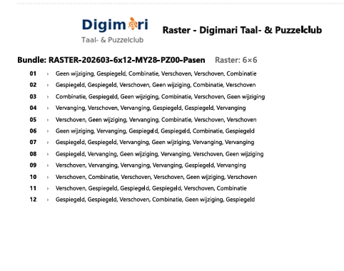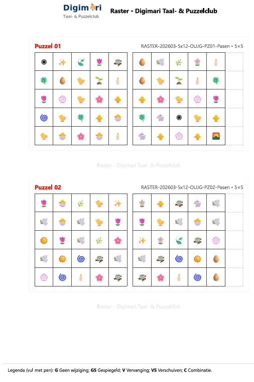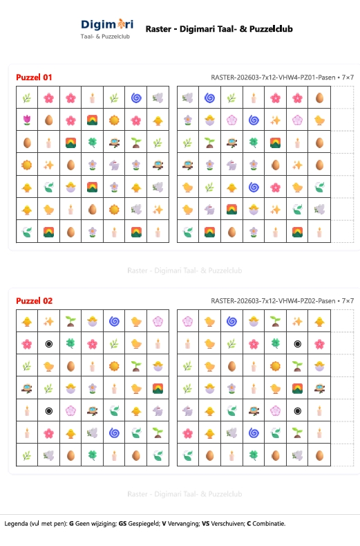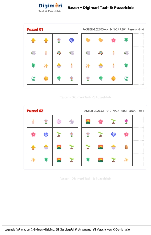 Een zorgvuldig samengesteld Paas‑puzzelboek in Digimari‑stijl, ontworpen voor rustige momenten van aandacht en spel. Deze digitale editie bevat 100 rasterpuzzels in vijf formaten (4×4 t/m 8×8), verdeeld over drie niveaus: