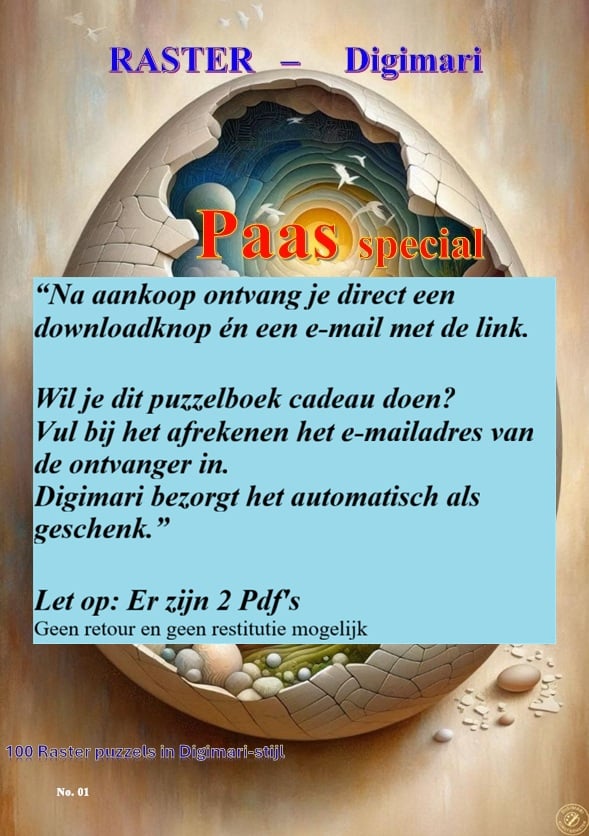 Paas Puzzelboek – 100 Rasterpuzzels + Printklare Kunstposter (Digimari‑stijl, PDF)