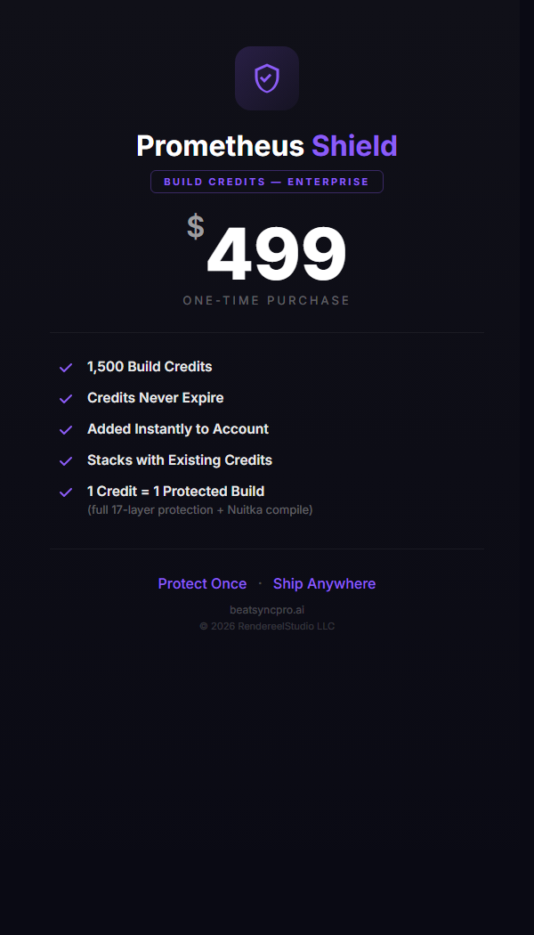 Add 1,500 build credits to your existing Prometheus Shield license. Our largest credit pack — best value for studios