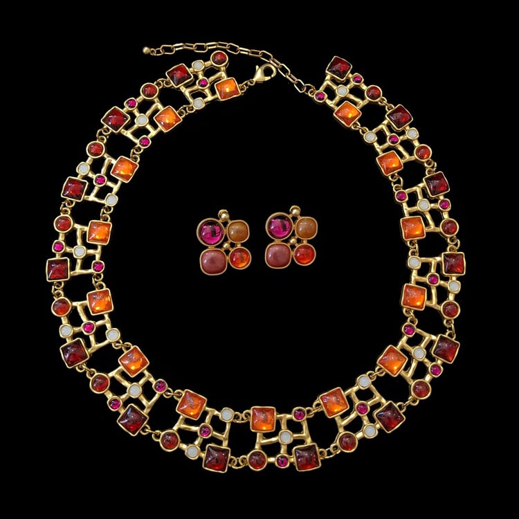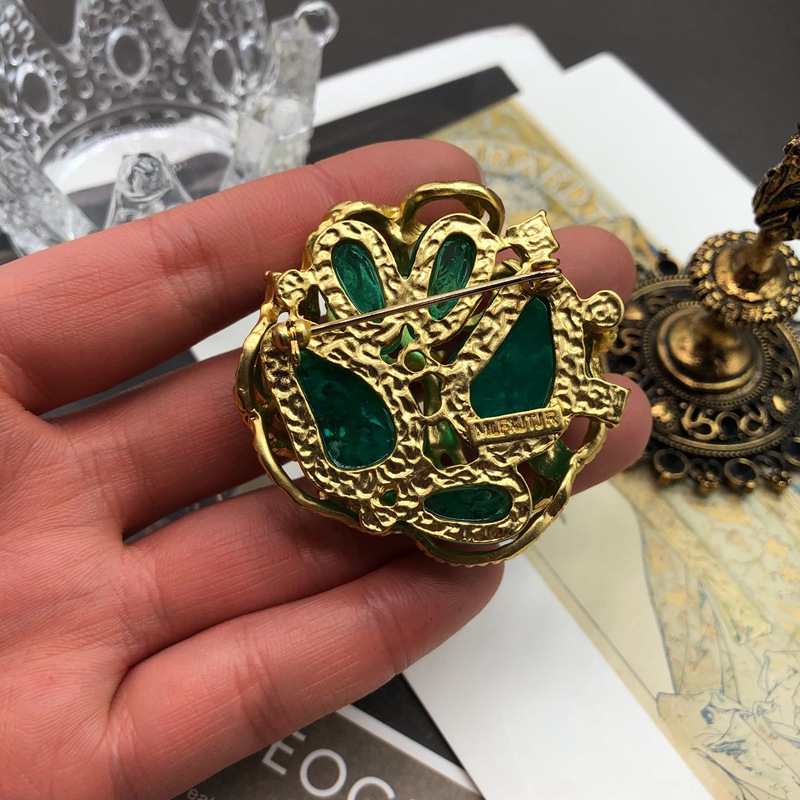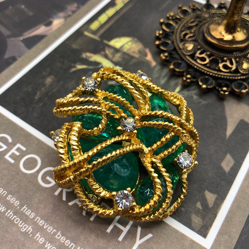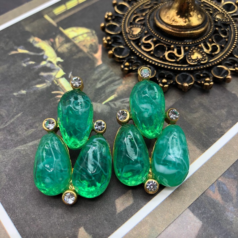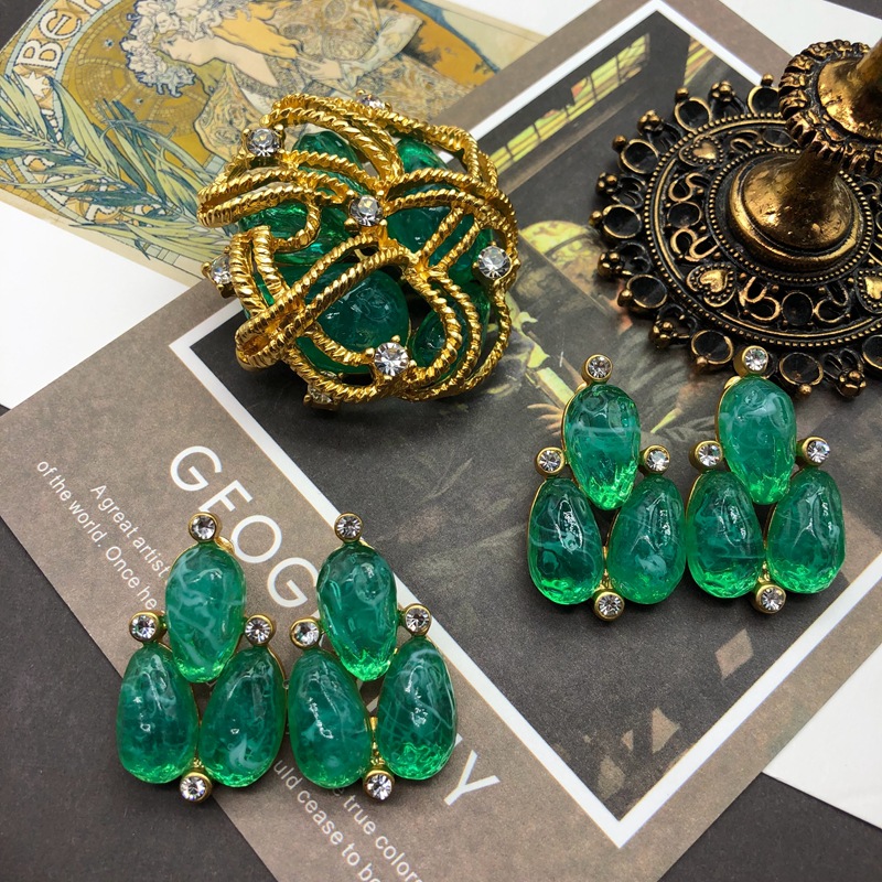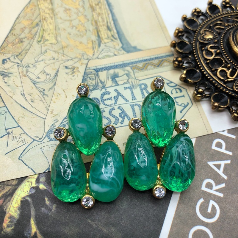 Vintage real gold plating transparent green moire pin ear clip brooch stud earrings