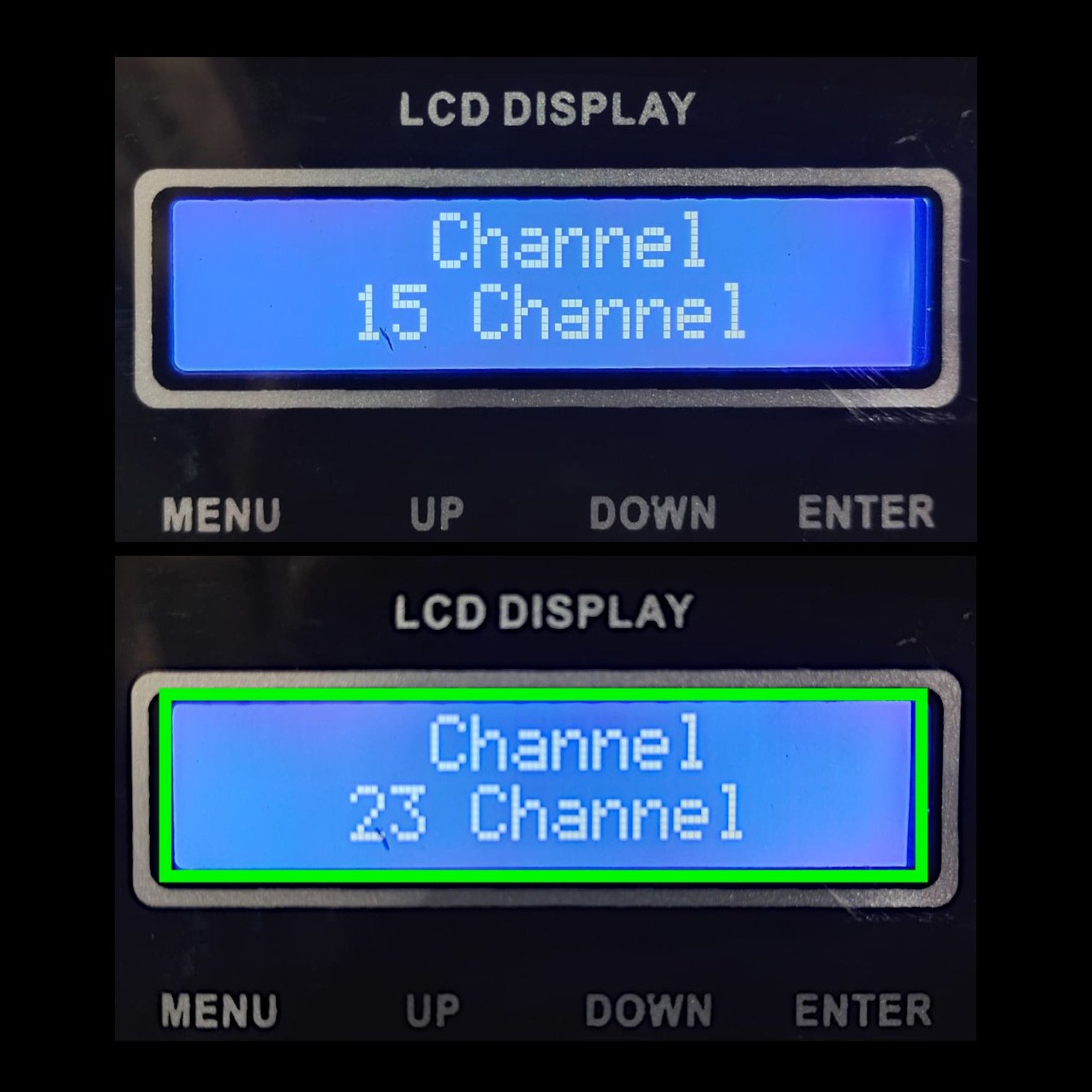* Verifique, desde el display del equipo, que el menú "Channel" muestre los modos dmx de "15 Channel" y "23 Channel" (ver tercer foto).