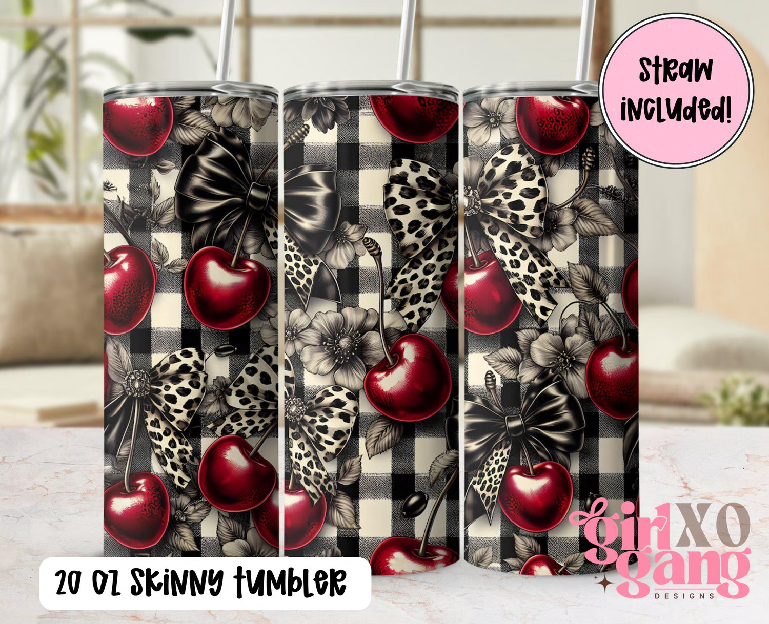 plaid Leopard coquette bows and Cherries 20 oz tumbler with plastic straw