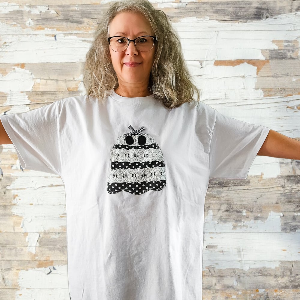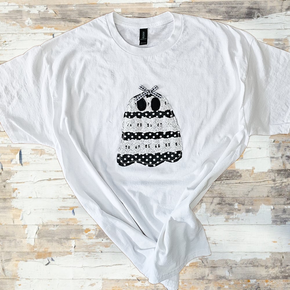 Charming patchwork ghost, machine stitched on a white Gildan cotton t-shirt. Includes ribbon accent. All materials have been prewashed and preshrunk. See my other designs, each is one of a kind.