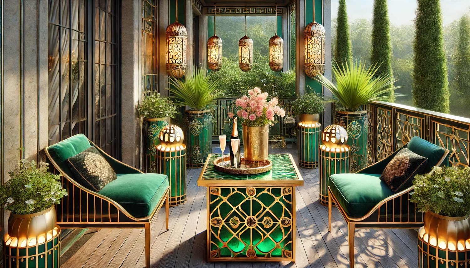 Step into a serene Art Deco dream with this elegant printable artwork, inspired by the opulence of The Great Gatsby. This digital illustration captures a golden-lit terrace with lush greenery, emerald velvet seating, and intricate gold details — perfect for anyone who loves vintage interiors, timeless beauty, and cinematic design.