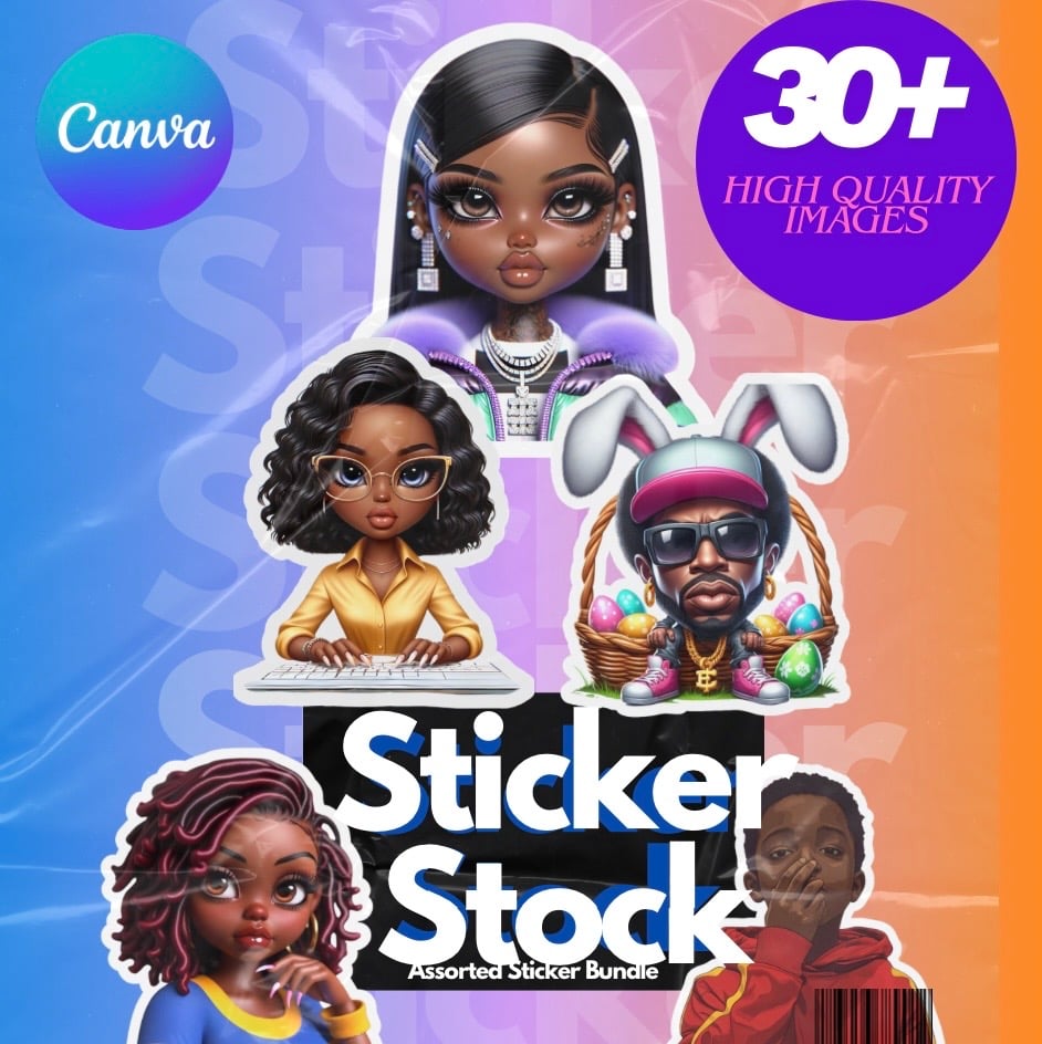 Upgrade your designs instantly with Sticker Stock — a premium bundle of 30+ high-quality, hyper-detailed character stickers created for Canva lovers, digital creators, small business owners, and content designers.