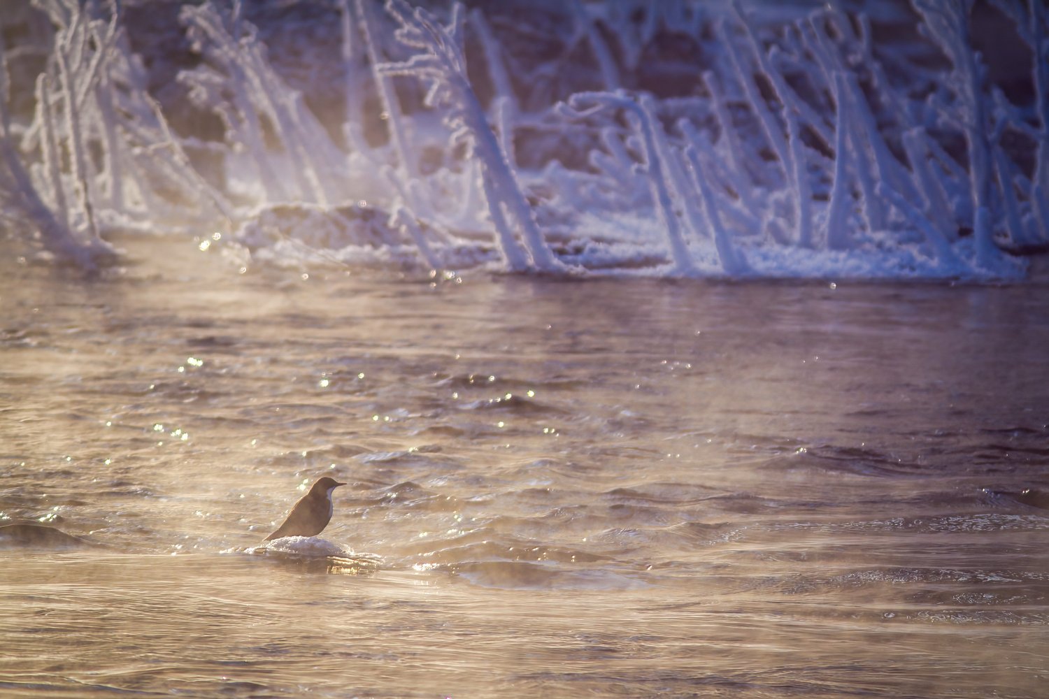 The White-throated dipper (Cinclus cinclus) on a steaming river. Cold frosty morning.