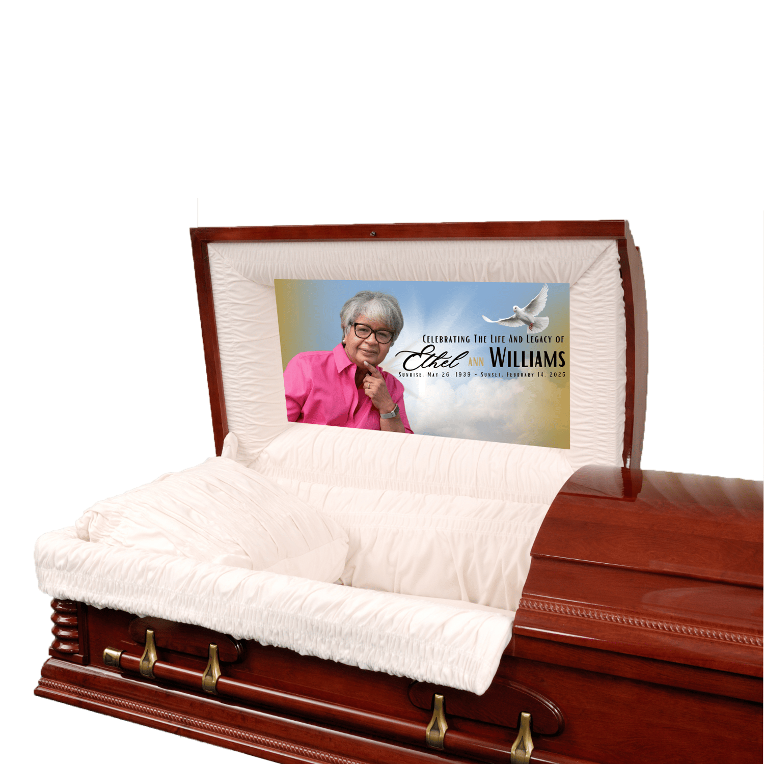 This personalized panel fits perfectly inside the lid of the casket, adding a warm, meaningful touch to any service. Each design is fully customized with your chosen photo, name, meaningful dates, and a special message or scripture — transforming a simple farewell into a lasting memory of love, honor, and remembrance.