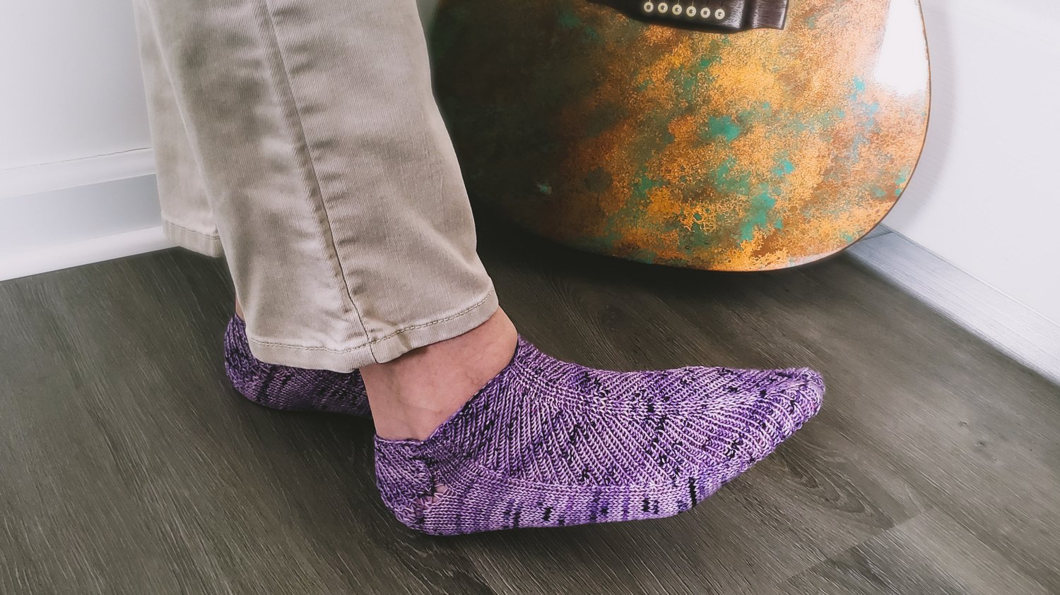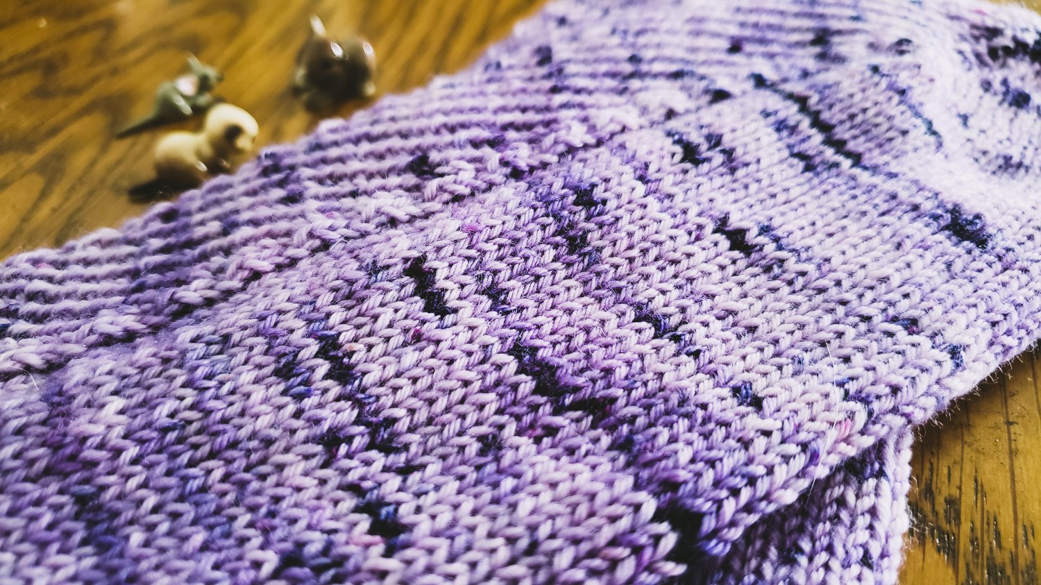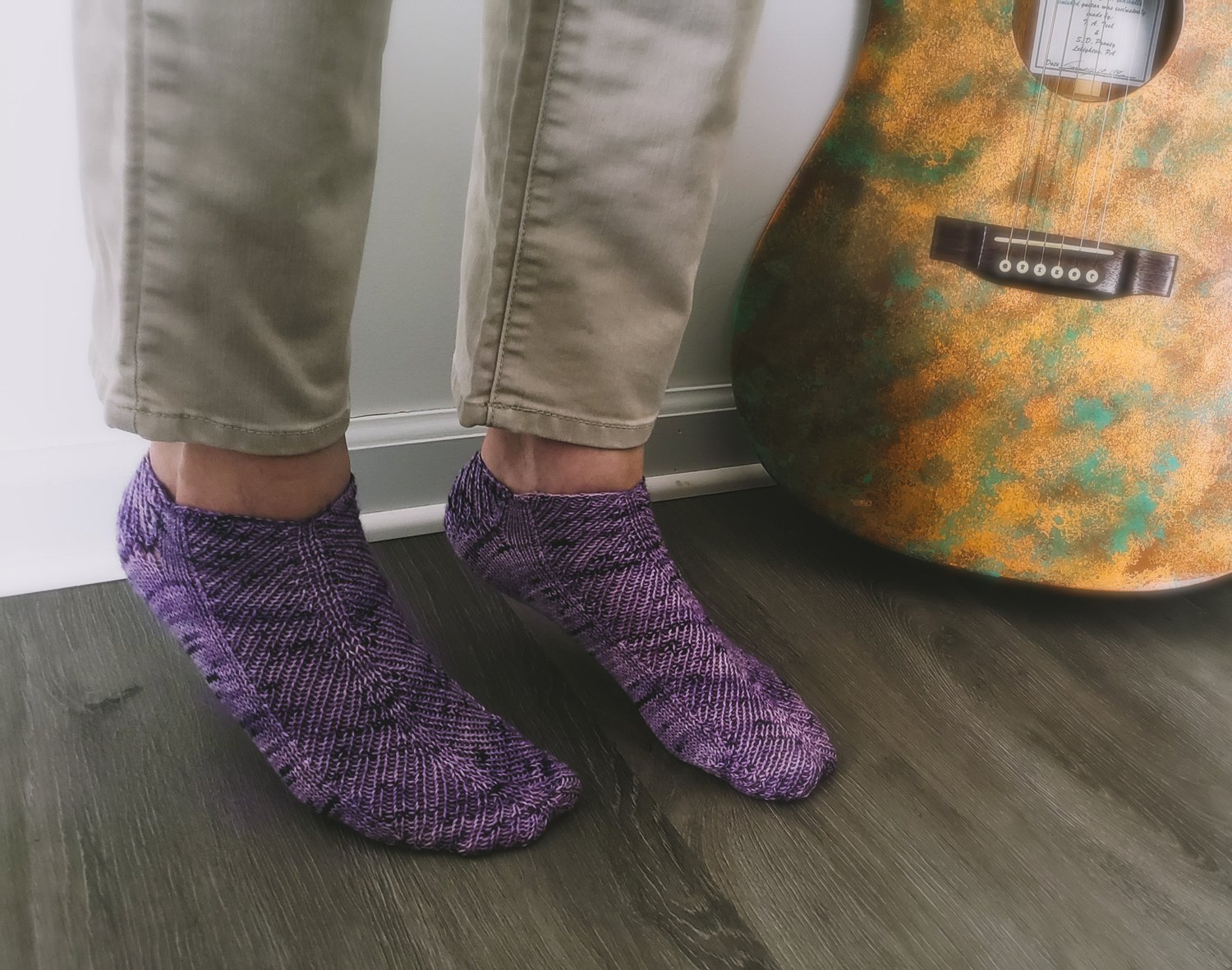 Sample used Queen’s Yarn Boutique Kiss Sock (75% Superwash Merino Wool/25% Nylon, 463 yd/100 g) in colorway Wisteria