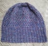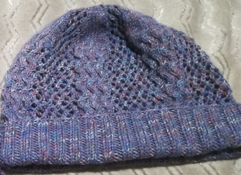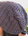 This is a remarkably simple yet pretty hat which involves only very basic repeating cable & lace stitch patterning, so that even an adventurous beginner who now wants to master more advanced knitting techniques could be encouraged to turn their hand to it, or for the more experienced knitter it offers enough interest without being too challenging. I have styled it as quite a slouchy hat, but this can be adjusted as you will see below under Finished measurements.