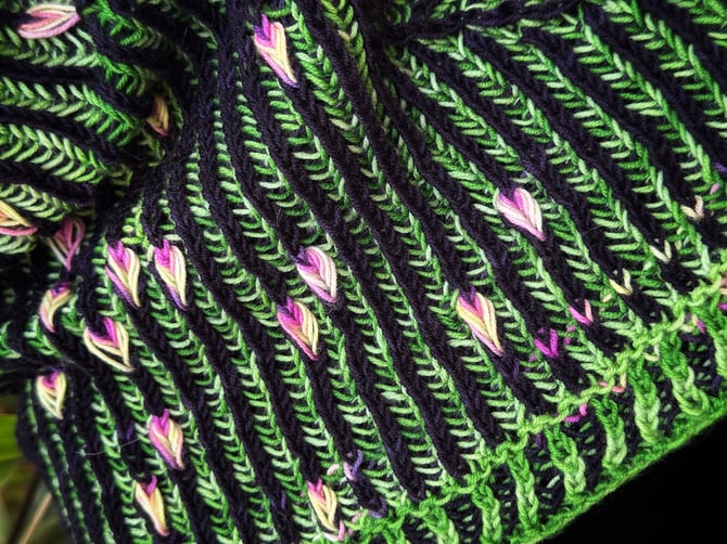 Scattered Petals is a two-color brioche rib bandana cowl, knit in the round from the bottom up. It features an assigned pooling motif, and contrast color edging. To me, those motifs look like tulips or flower petals. To you, they may be leaves. Let your imagination and colors be your guide! Choose 2 skeins of fingering weight yarn, one of which should be dyed for assigned pooling.