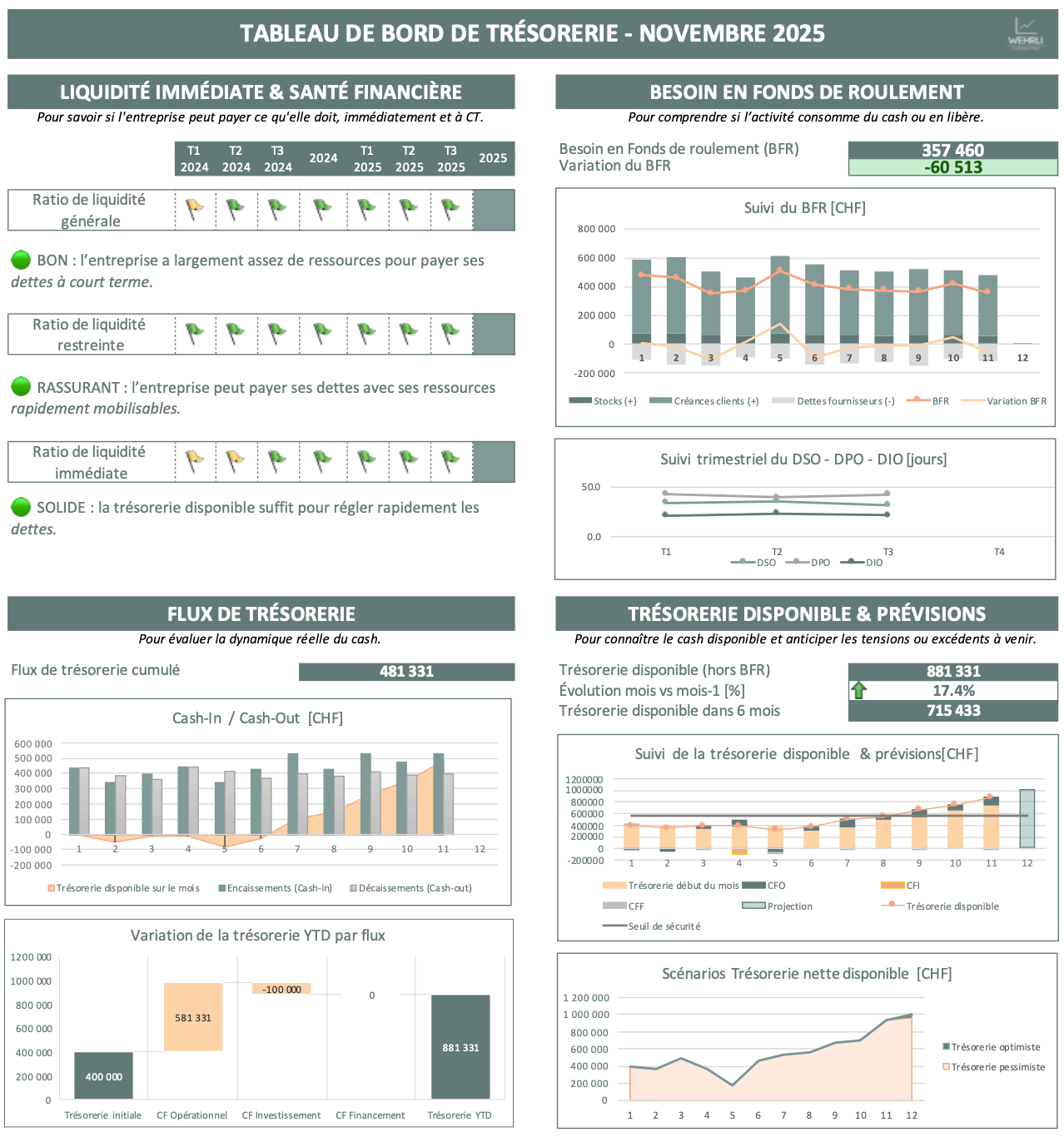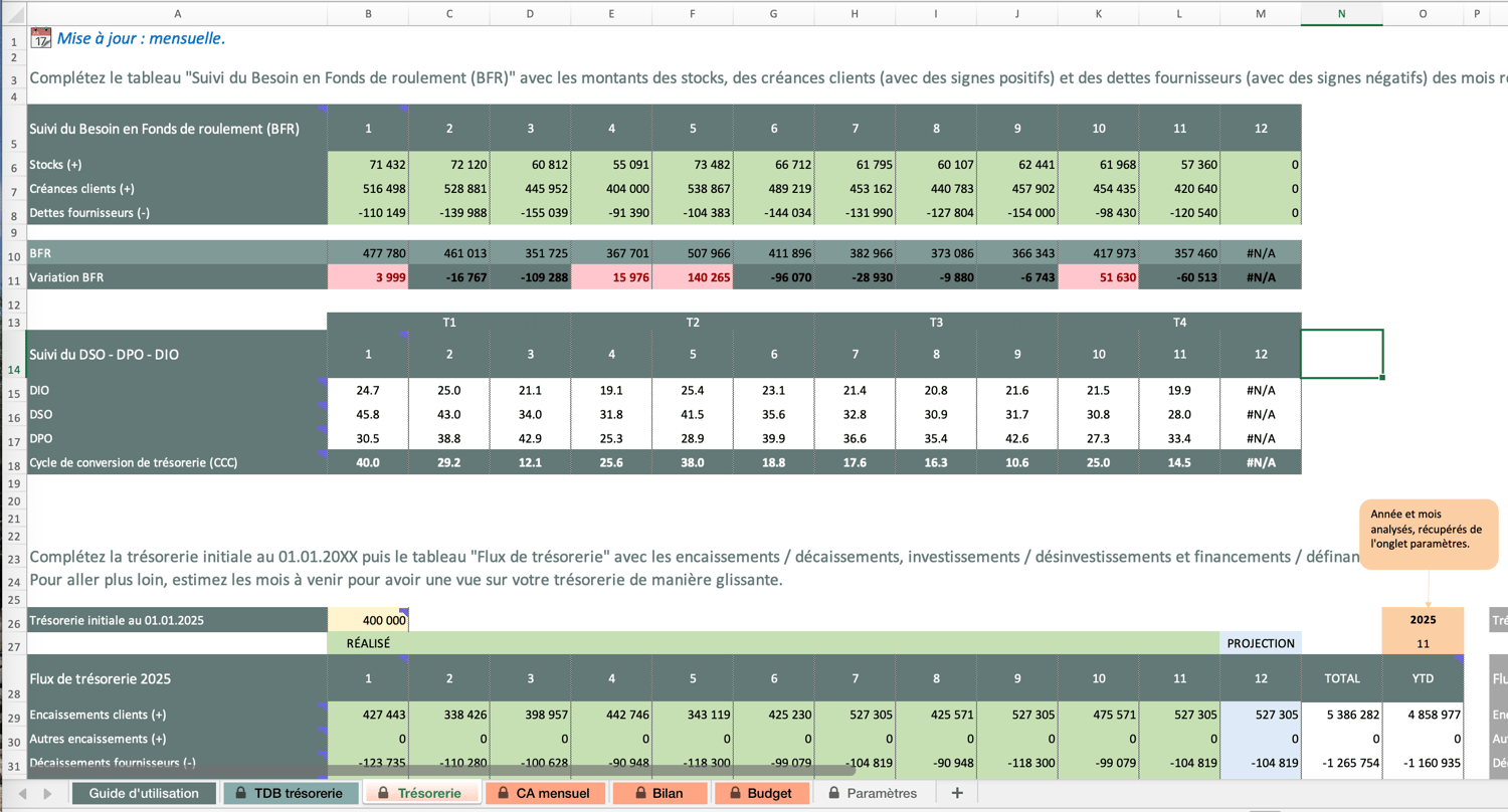 Vous accédez à un outil simple, clair et entièrement automatisé pour analyser votre cash, suivre vos flux, comprendre votre BFR et projeter votre trésorerie mois par mois.