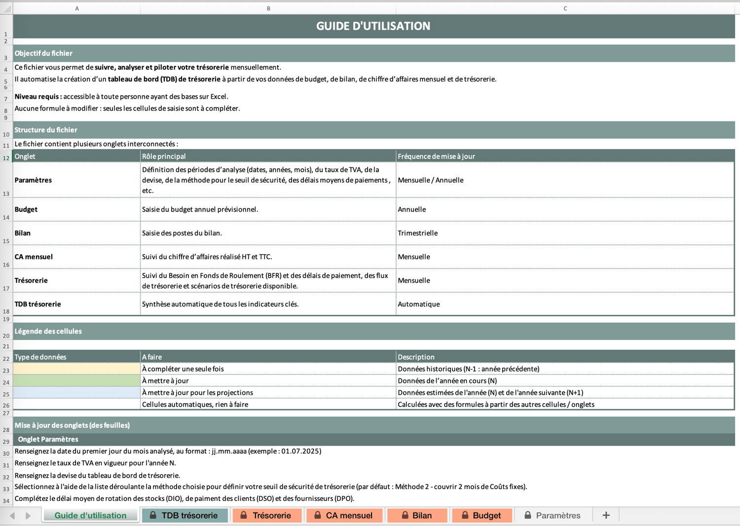 Ce tableau de bord a été conçu pour les dirigeants de TPE/PME, indépendants et créateurs d’entreprise qui veulent anticiper, sécuriser et piloter leur trésorerie sans être experts en finance.