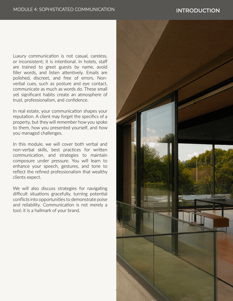 From tone of voice to lighting to the energy you bring into a room, you will learn the nuances of creating a luxury-level experience. These are the invisible details that clients might not articulate but will always feel — and remember when deciding who to trust.