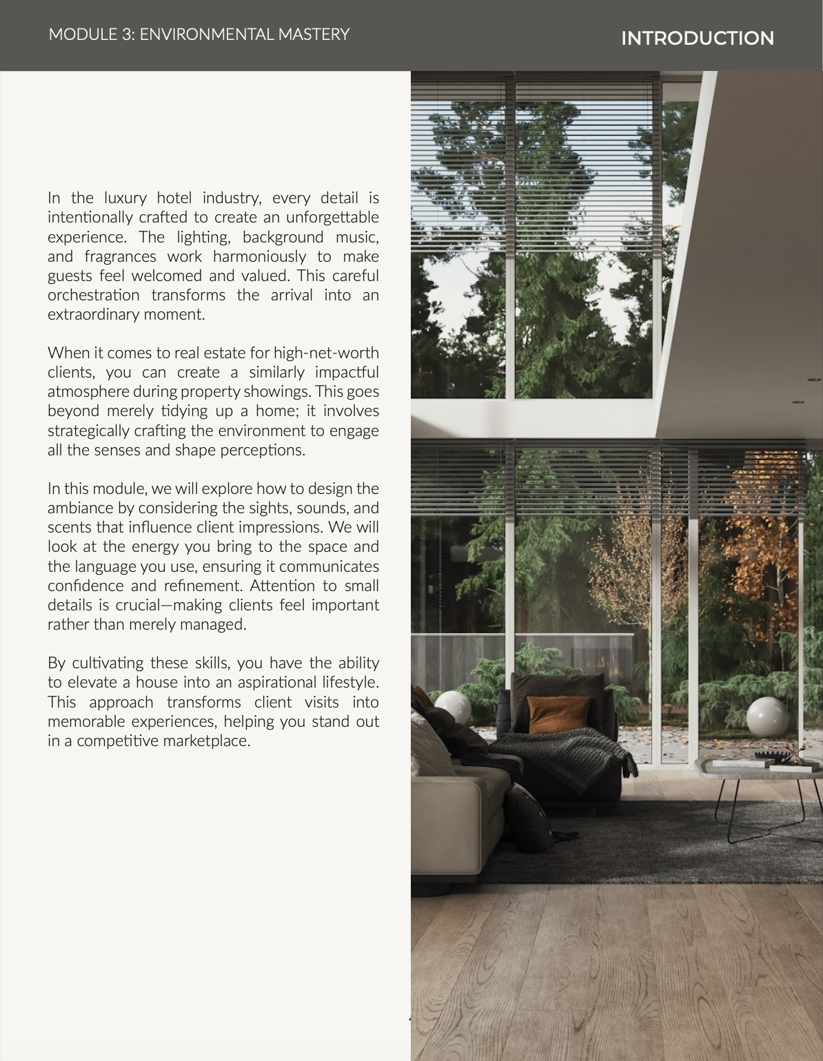 A property does not sell itself — it is the story you tell, the environment you create, and the small touches that linger in your client’s memory. This module reveals how to turn every showing into a stage set for success, where ambiance amplifies value.