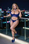 Midnight air. Glass rails. The skyline glittering like it’s watching—while I stand there in blue that doesn’t whisper… it purrs.