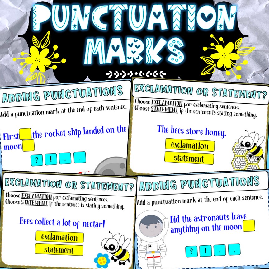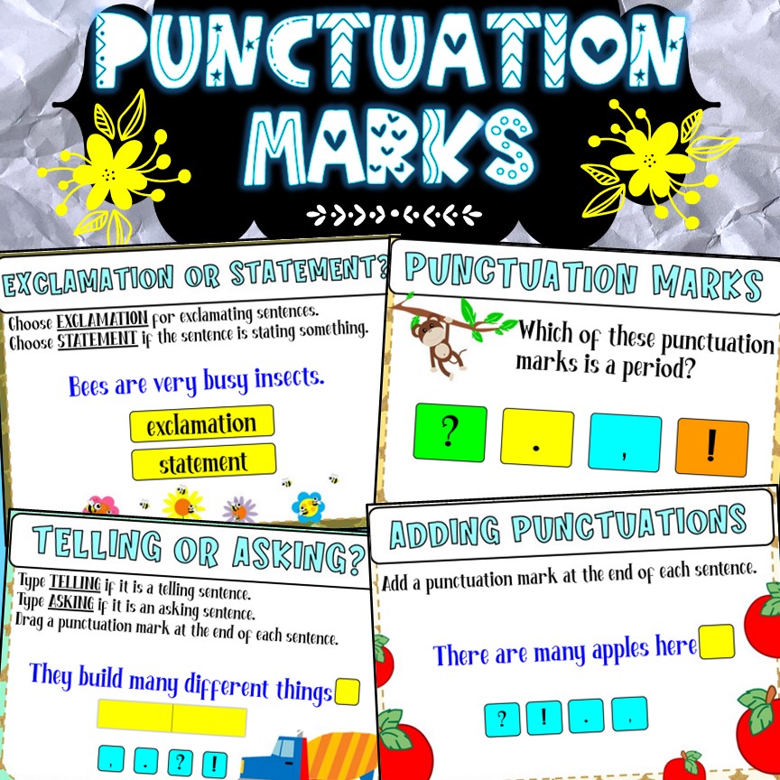hese BOOM cards have four like stories that will have them placing and using commas, periods, exclamation, and interrogation marks. These great BOOM cards will keep them engaged and learning while going over the different type of punctuation marks and when to use them.