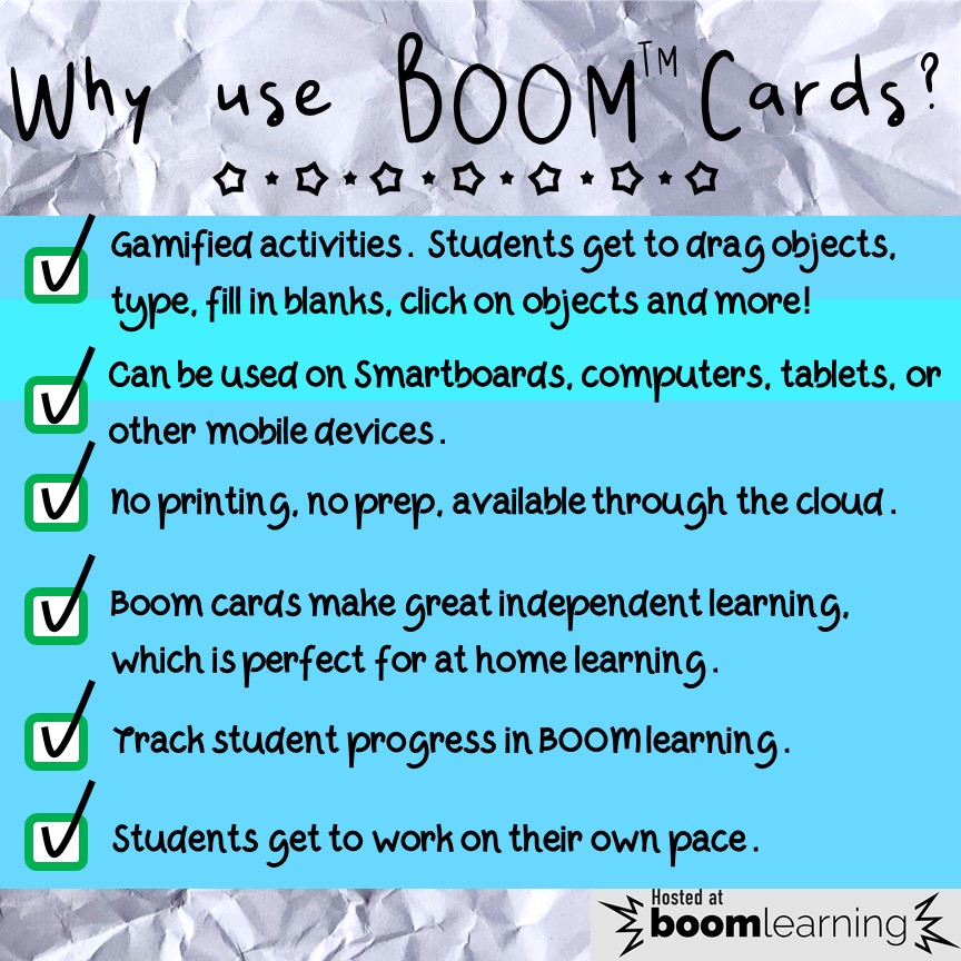 To use Boom Cards, you must be connected to the Internet. Boom Cards play on modern browsers (Chrome, Safari, Firefox, and Edge). Apps are available for Android, iPads, iPhones, and Kindle Fires. For security and privacy, adults must have a Boom Learning account to use and assign Boom Cards. You will be able to assign the Boom Cards you are buying with "Fast Pins," (play provides instant feedback for self-grading Boom Cards). Fast Play is always a free way for students to engage with Boom Cards decks.
