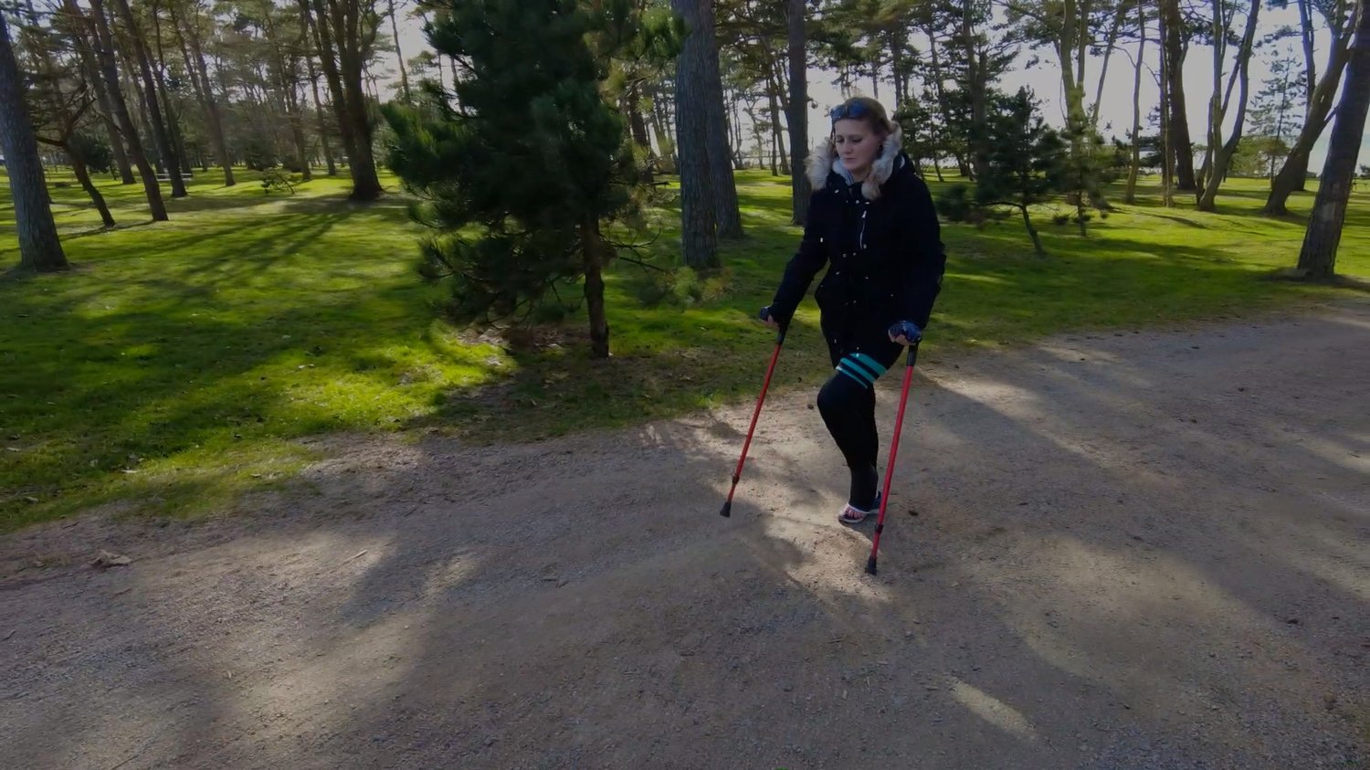 Roxy is outside just clearing her mind in nature, she’s seen crossing grass with her left leg broken and casted in a black SLC, she’s impressively crutching very well, through dirt paths, many grass and shortcuts. Roxy only stops a few times and very shortly on the way, it might not seem like it but she gets tired as well. Roxy sits down after a while and takes a rest by the side of the road on a huge rock. Slowly step by step, she takes herself back to the car and carefully gets inside without hurting herself.