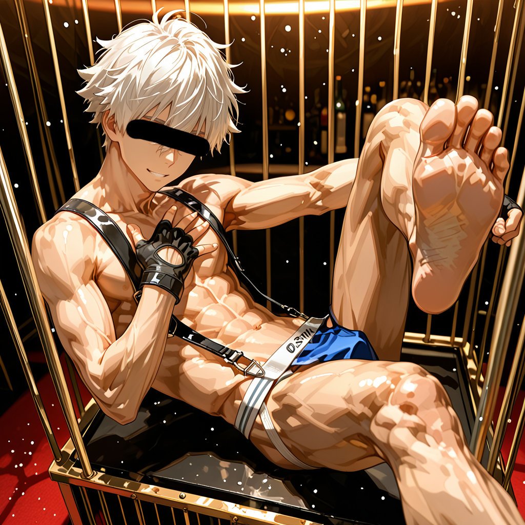男性ショーダンサーをテーマに、ジョックストラップとサスペンダーを着せて、ポールと鳥かごをテーマに、キャラクターの魅力を存分に表現しました。