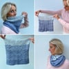Designed for a fade set of 5 miniskeins that move from light to dark, the Orford Cowl’s panel and ridge construction lends itself perfectly to playing with colour. A miniskein set of different colours would produce a colourblock cowl, or a single skein of fingering weight yarn would give a more classic look.