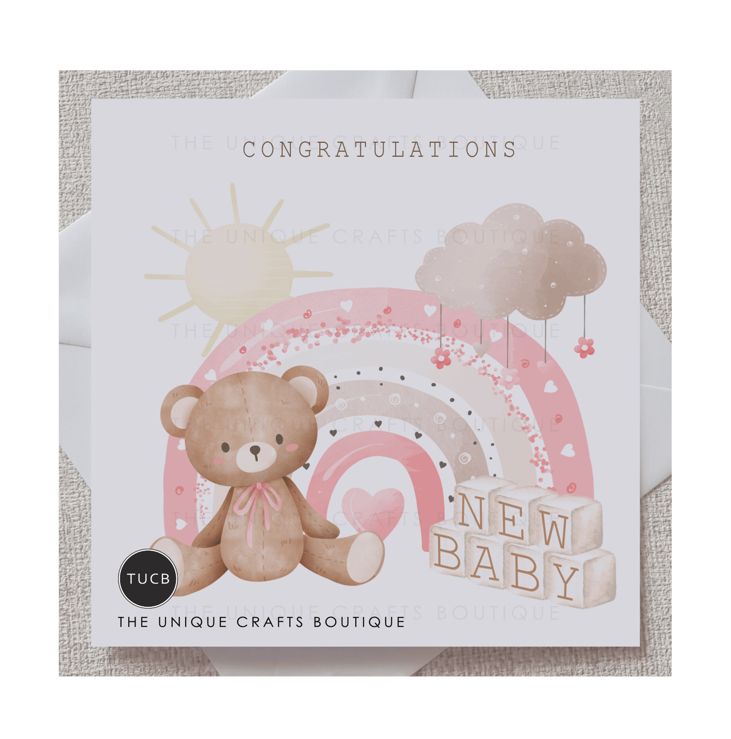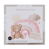This card is perfect for the celebration of a beautiful new baby Girl. Printed with a cute Brown and Pink rainbow and a sweet little Brown bear accompanied with a set of building blocks which reads 'new baby' inside each brick. A soft little sunshine and fluffy brown cloud give the perfect finish to welcome a new little one into the world.