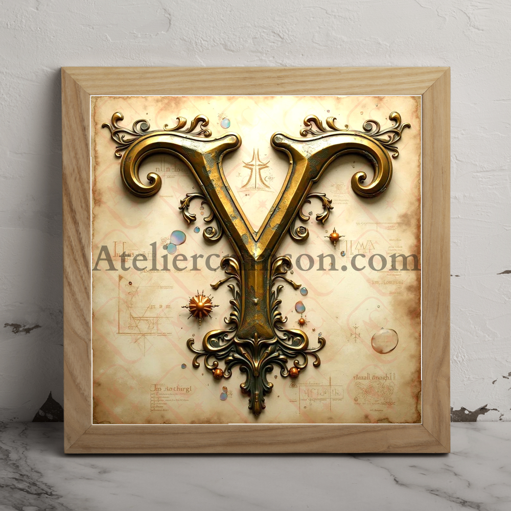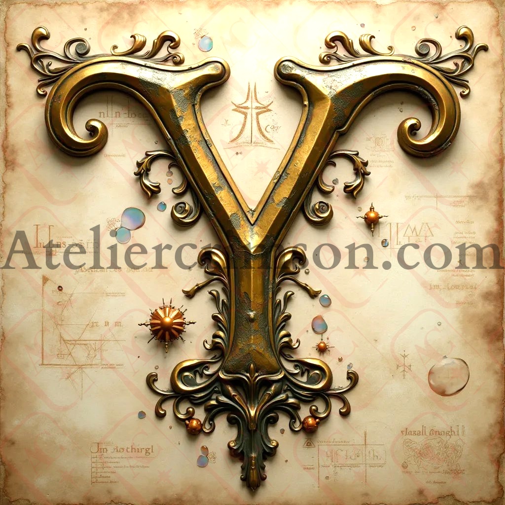 The letter Y Art Nouveau alchemical Each character crafted as a stunning 3D brass sculpture with weathered patina, set against a mystical alchemical parchment. Ornate vines, floating bubbles, and antique gears create a magical shabby chic atmosphere. Perfect for vintage-inspired designs, book covers, or unique wall art."