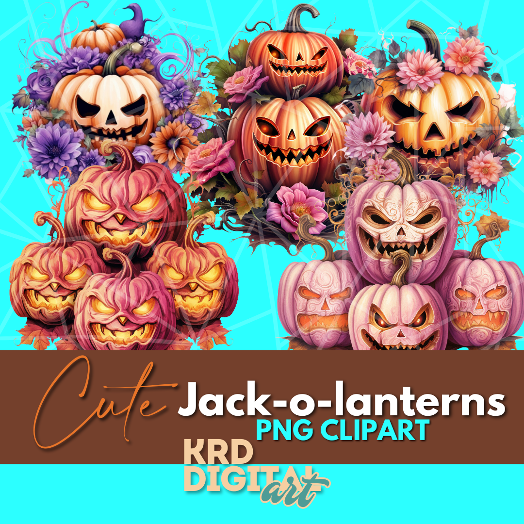 Cute Jack-O-Lanterns PNG Clipart Bundle – Floral Pumpkin Faces, Pastel & Classic Halloween Pumpkins | Transparent Background, 300 DPI