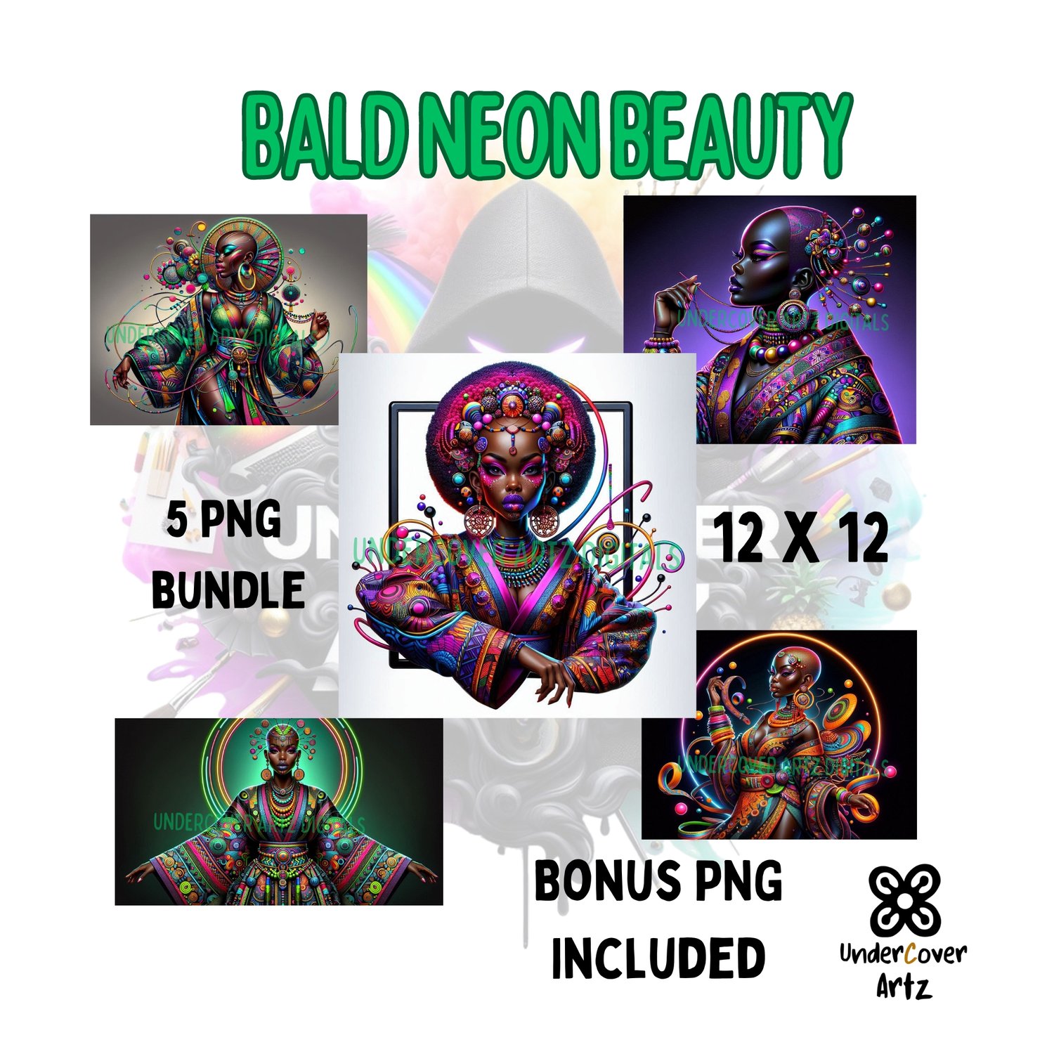 Elevate your creative projects with the "Bald Neon Beauty" 5-piece PNG bundle, featuring stunning Afrocentric designs. Perfect for both digital and print use, these high-resolution images bring a touch of cultural elegance to any creation.
