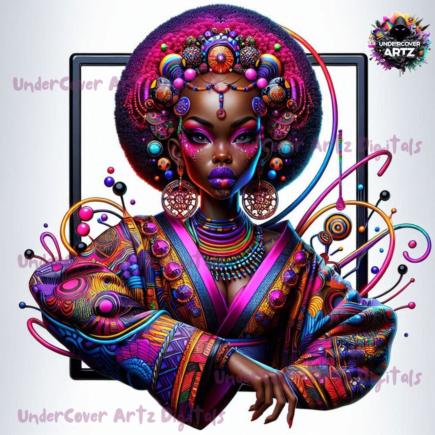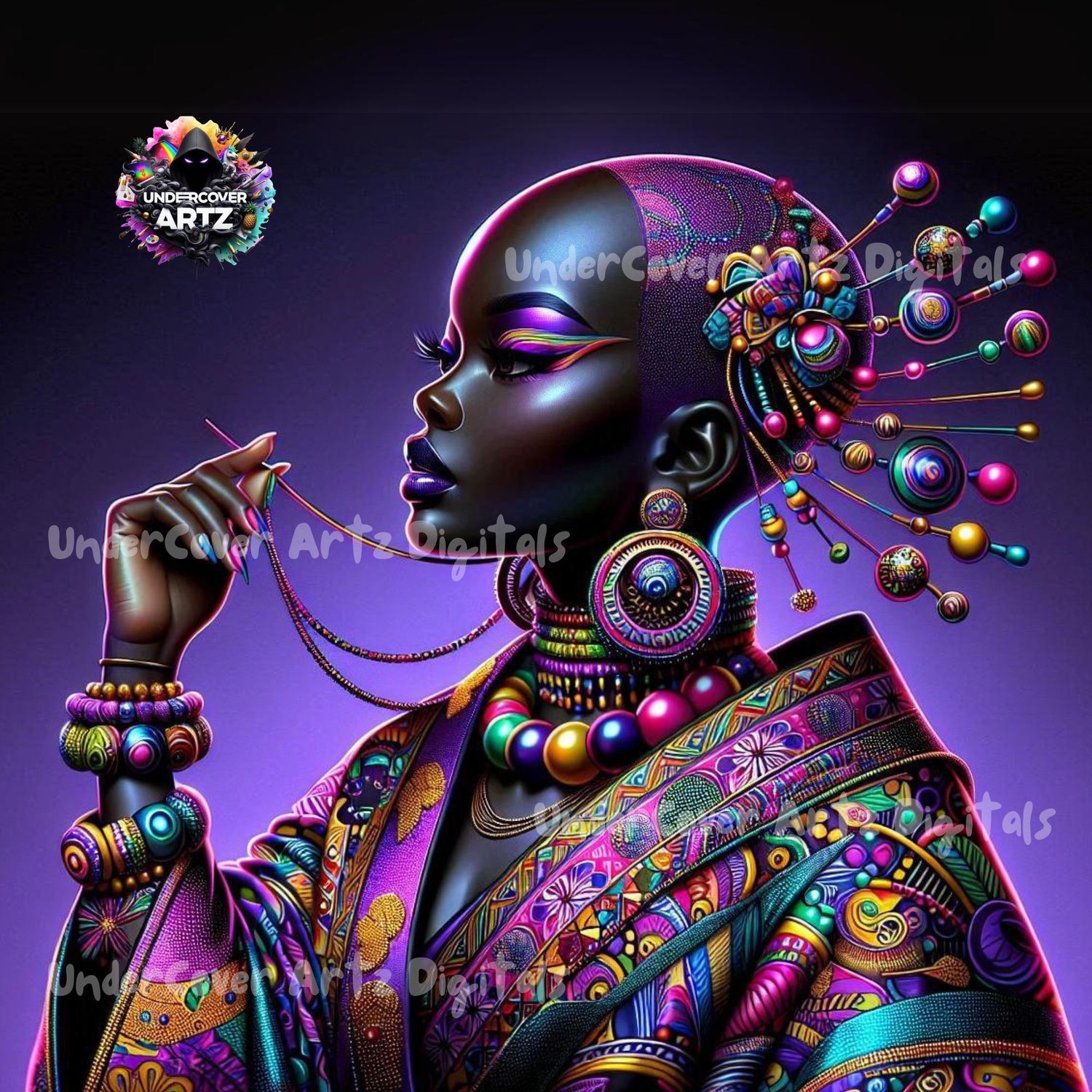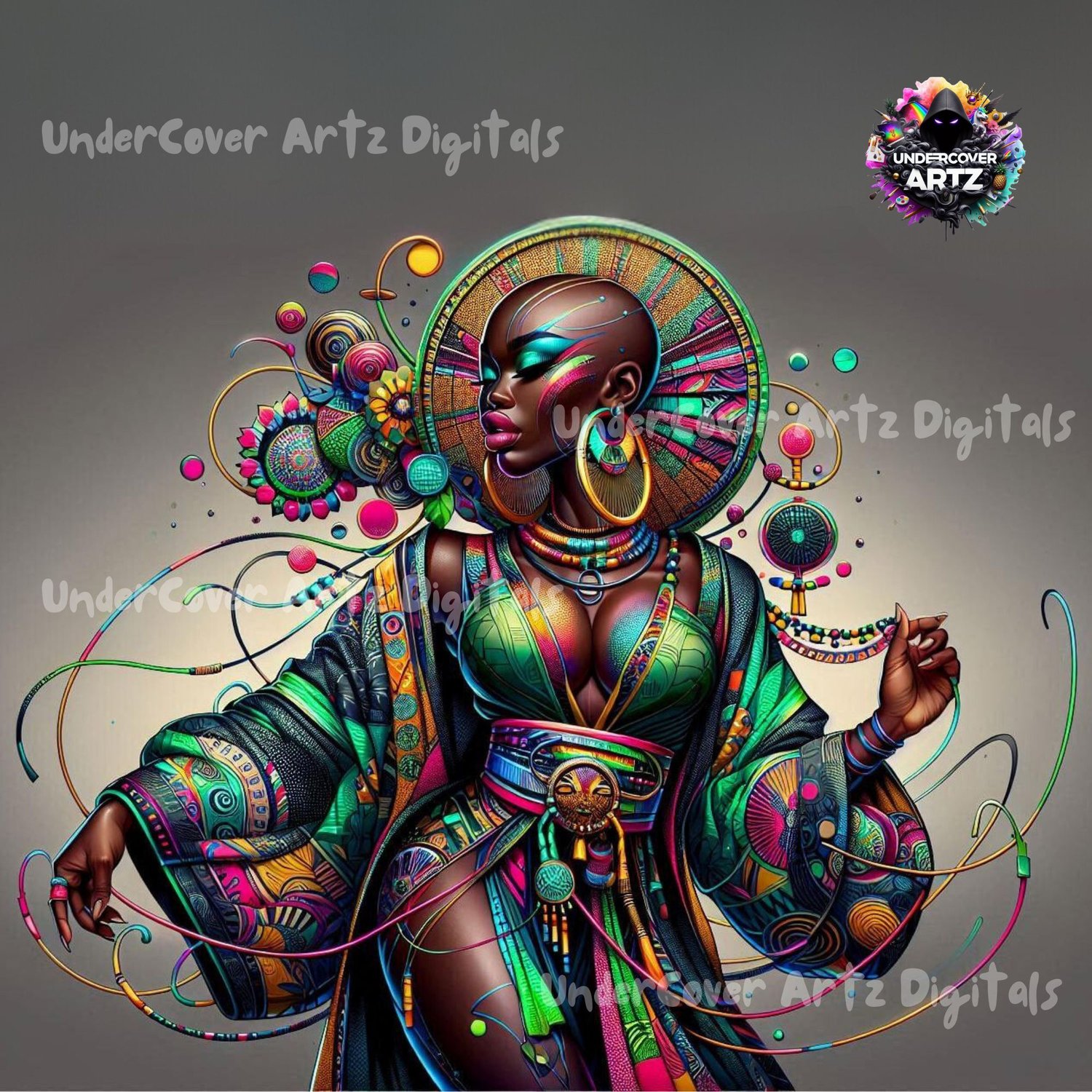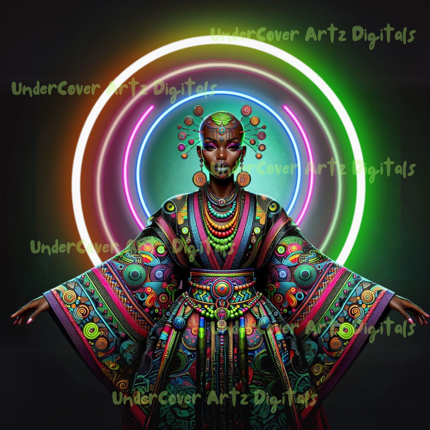 - Neon Empress - Striking depiction of a woman in colorful, intricate attire.