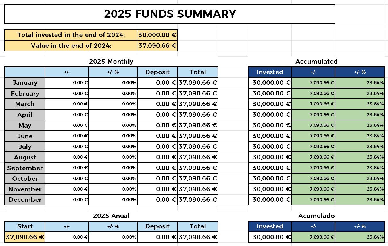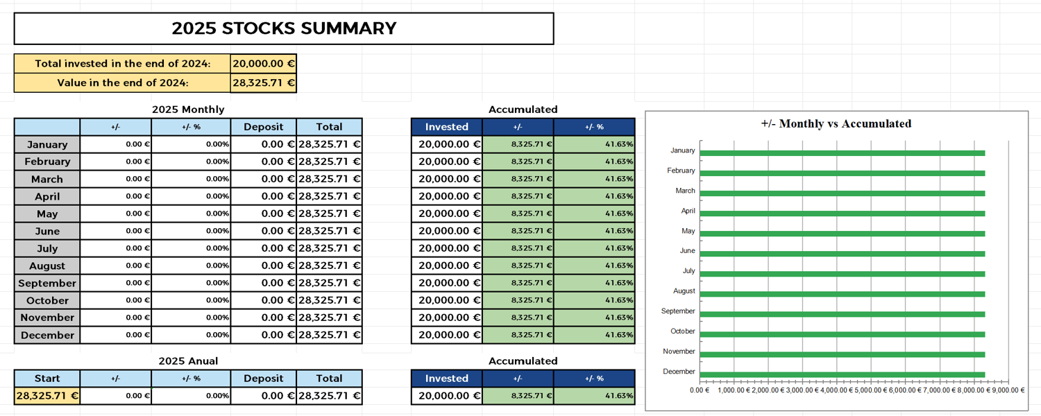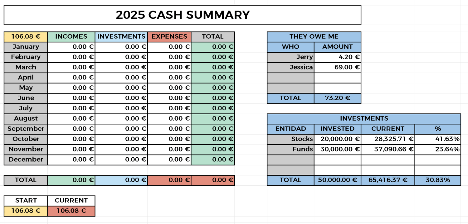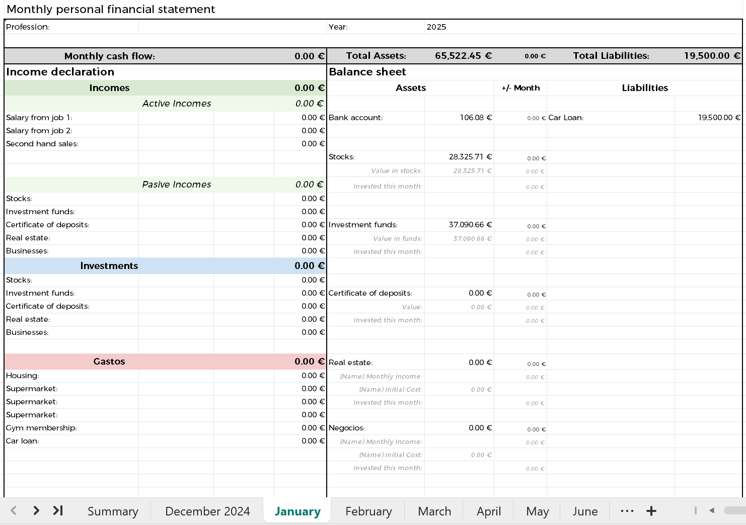 I use this template for organising and controlling my personal finances. I fullfill it at the end of each month, copying the information from my bank accounts, brokers, etc. It takes me less than one hour each time. Doing it manually at the end of each month gives me a better understanding of the numbers, and that is why I prefer to do it like this instead of using an automatic application.