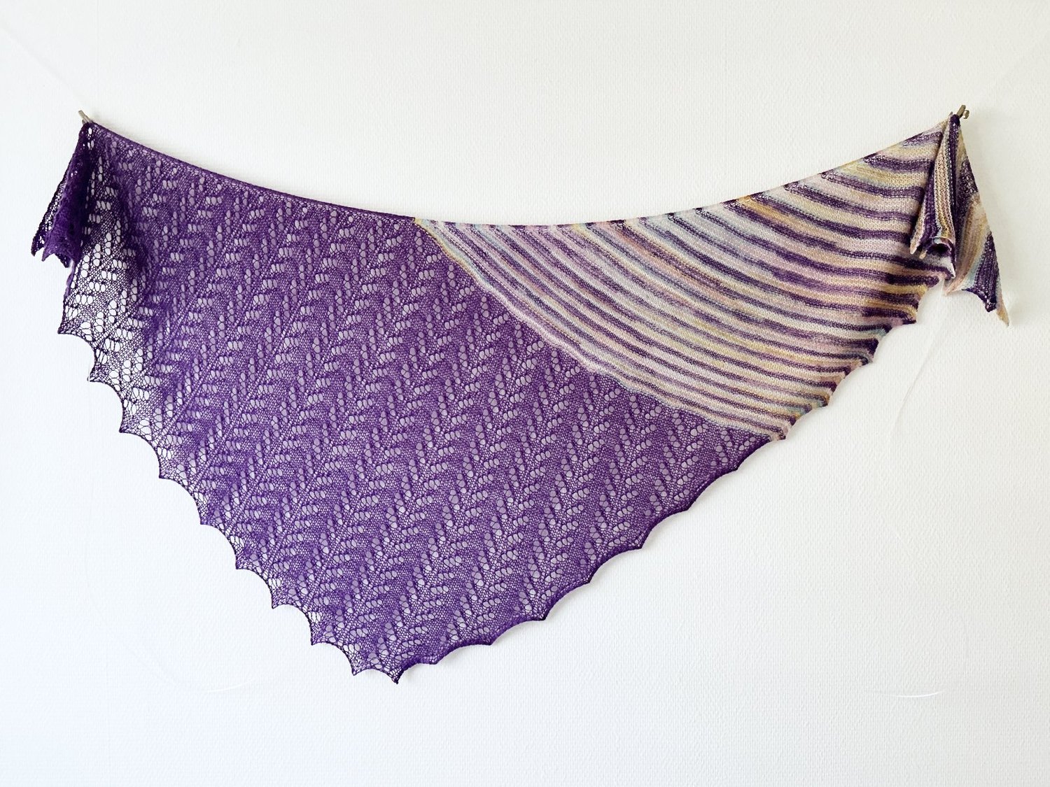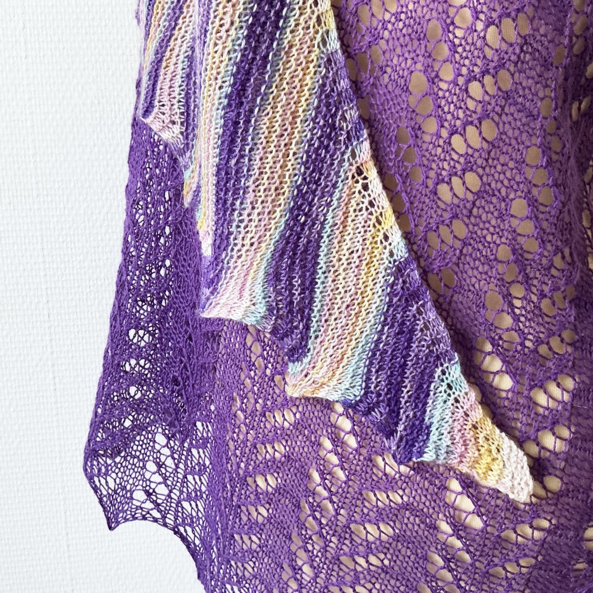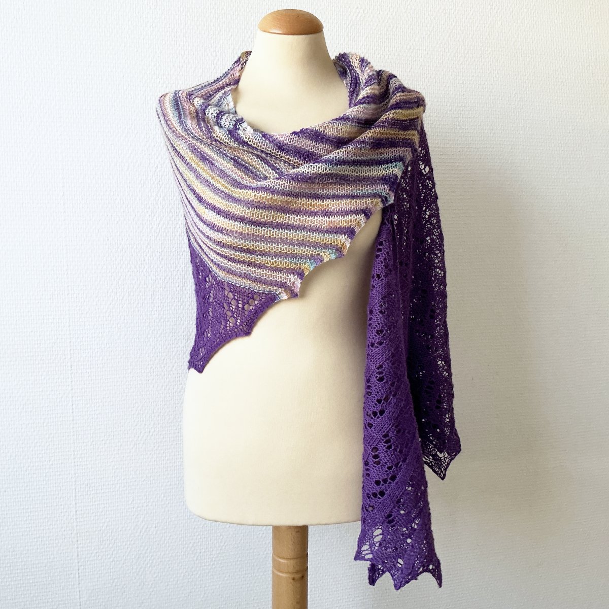 The yarn used for the body of this shawl brings candy canes to mind, or “zuurstokken”, as they’re called in Dutch, the kind you might buy at a fair. Knit sideways on the bias, the shawl forms a shallow, asymmetrical triangle that’s perfect for wearing as an elegant scarf. The pairing of garter stitch in a self-striping yarn with simple lace offers the best of both worlds: Soothing simplicity and delicate detail.