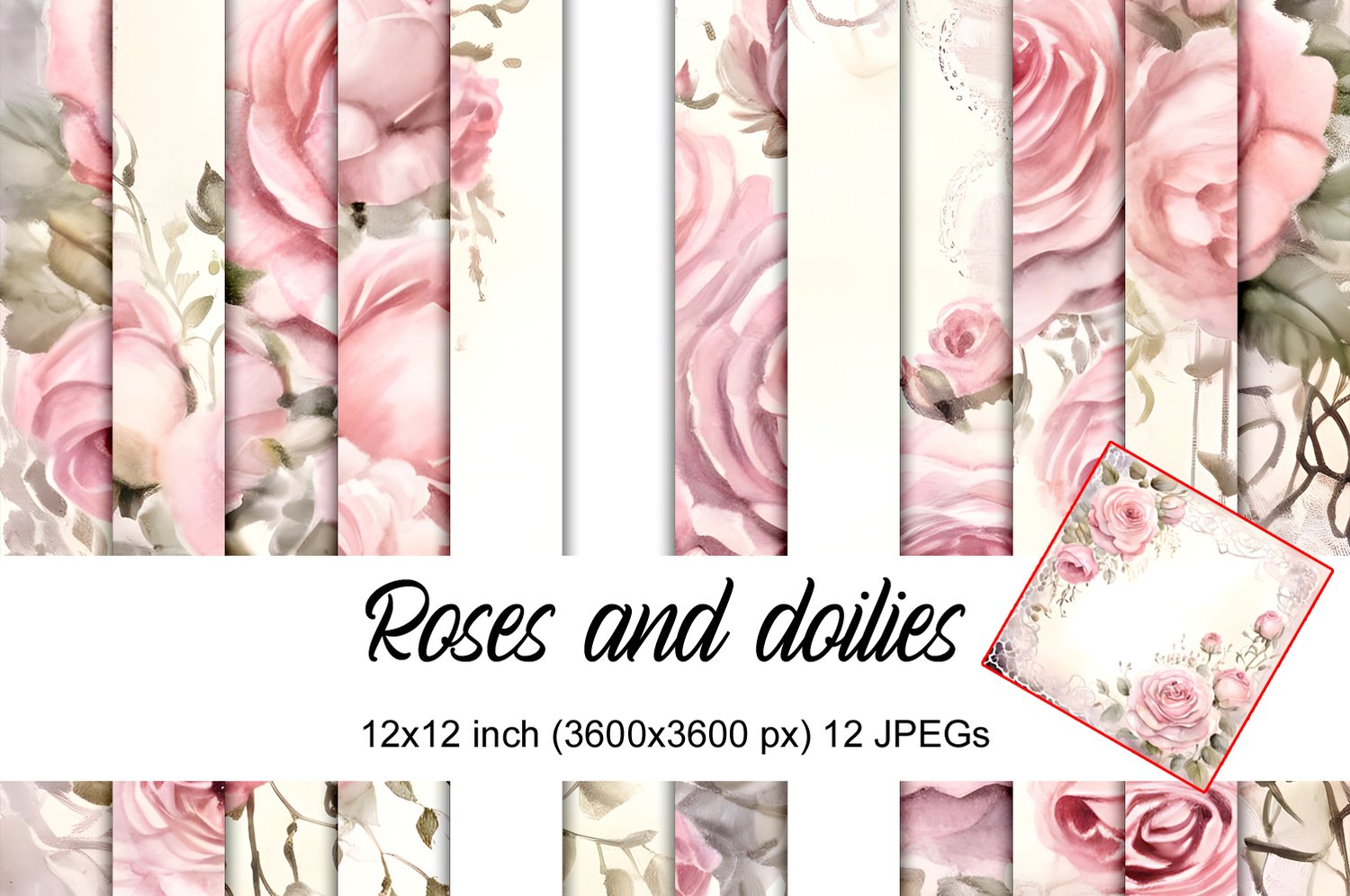 Keywords: roses and doilies digital papers, vintage floral scrapbook papers, lace border digital backgrounds, shabby chic floral paper pack, romantic rose digital papers, antique floral scrapbook papers, feminine vintage digital papers, lace and flower digital papers, rose watercolor background pack, cottagecore floral papers, pink lace digital papers, vintage romance scrapbook papers, delicate floral craft papers