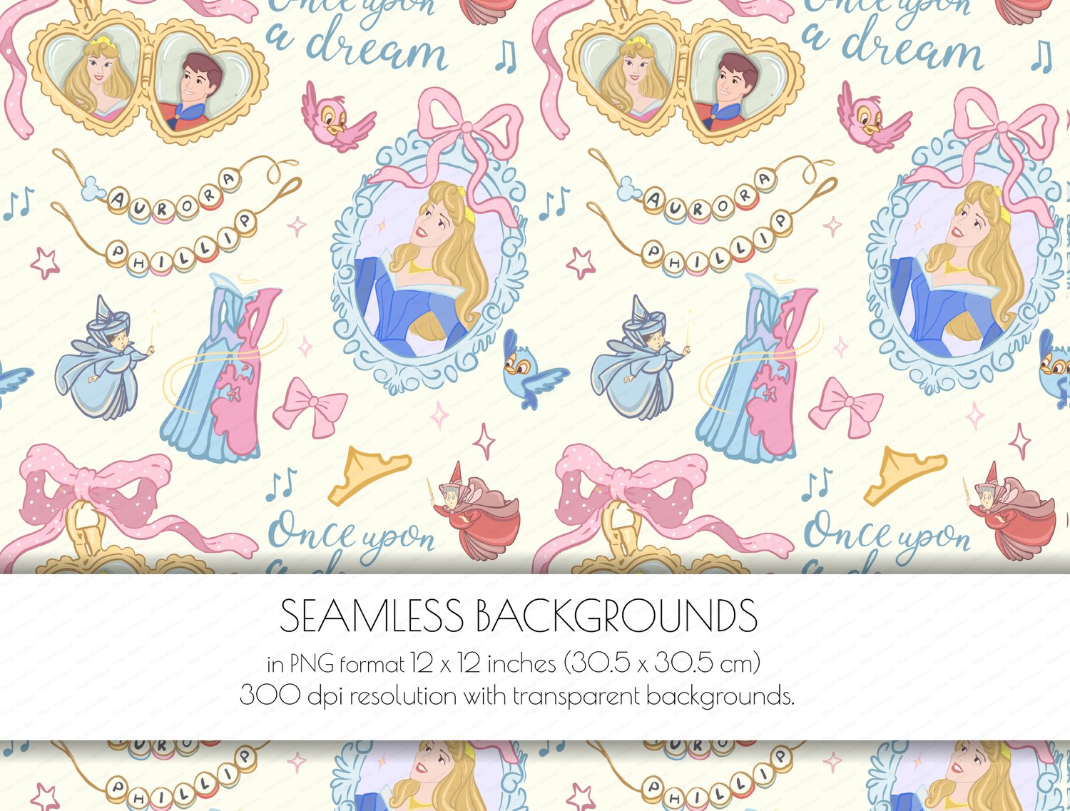 1 Princess Aurora, Sleeping Beauty, Seamlessbackground in PNG format 12 x 12 inches (30.5 x 30.5 cm) 300 dpi resolution .