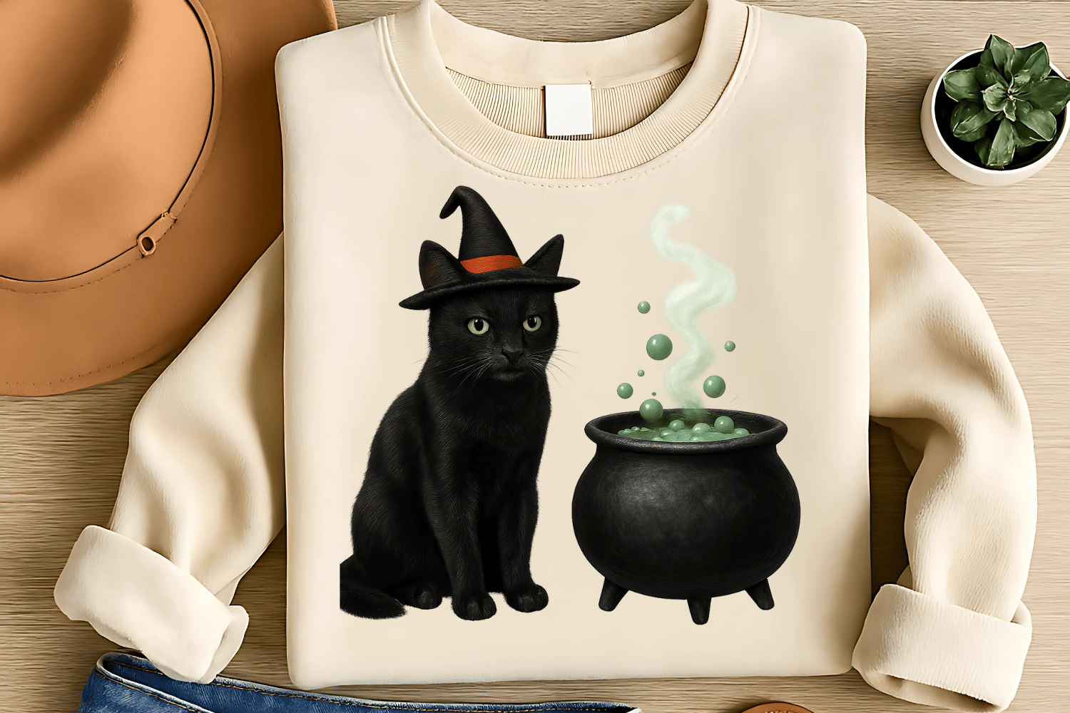 Witch’s Familiar Black Cat Sublimation PNG – Magical Clipart for T-Shirts – Classic Halloween Theme – 300 DPI Instant Digital Download