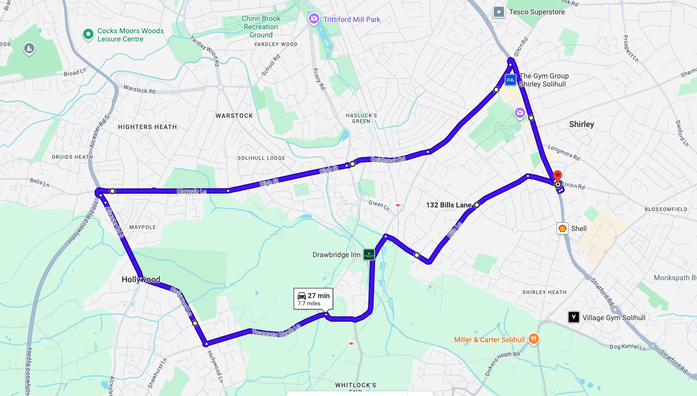 Practise real driving test routes in Birmingham (Shirley) before your exam – open directly in Google Maps