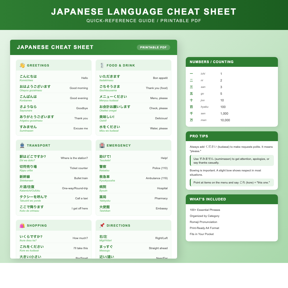 Master Japanese basics with this beautifully designed interactive cheat sheet! Perfect for travelers, students, and Japan enthusiasts.