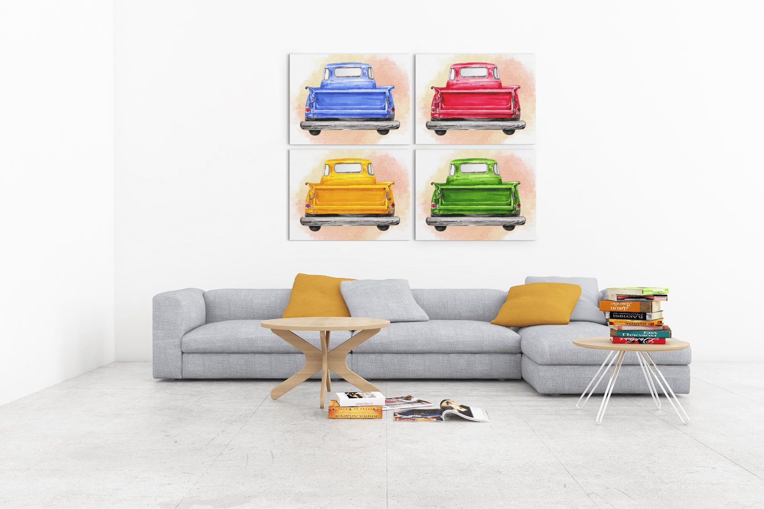Primary-colored classic trucks bring a playful retro vibe to any child’s room.