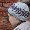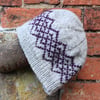 Combining two colours and a simple geometric colourwork pattern creates a fetching unisex beanie. The sample is worked in a warm woolly yarn- a blend of Portland and Black Welsh Mountain breeds sourced from a single farm.