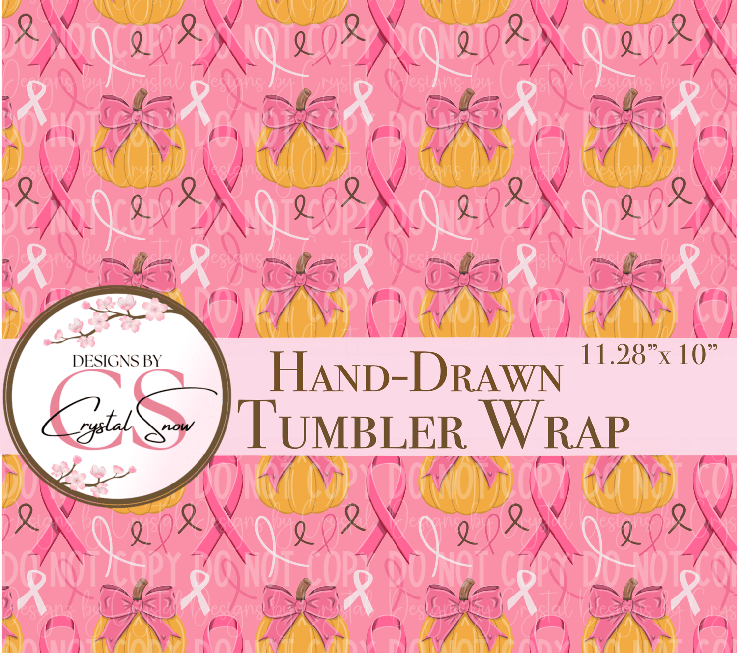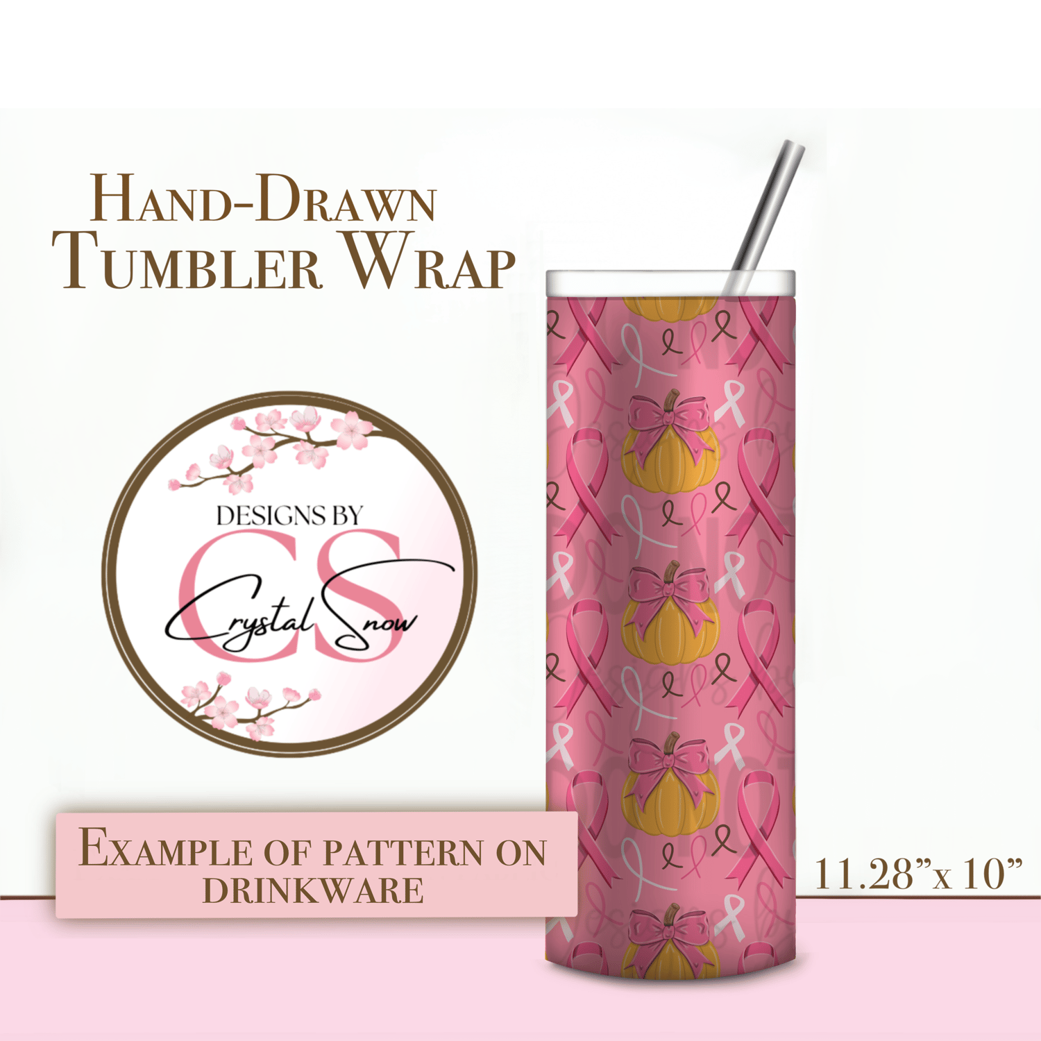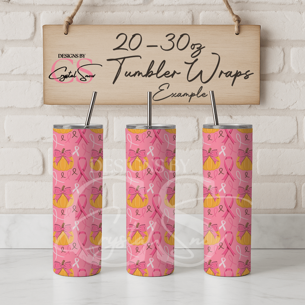 This hand-drawn 20oz skinny tumbler wrap blends pink ribbons, bows, and pumpkins to create a heartfelt design perfect for October awareness projects or fall drinkware. Sized at 11.28" x 10" (300 dpi, RGB), this seamless wrap is ready to sublimate onto straight skinny tumblers.