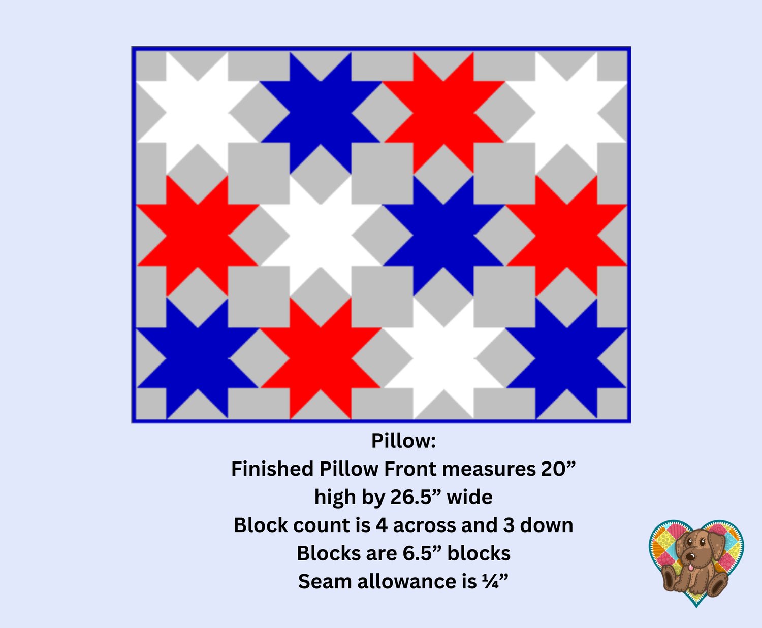 Pillow sham quilt front is 20" X 26.5" Blocks are traditional pieced blocks.
