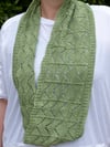 Just Pass the Bottle is a cowl that knit in the round and utilizes a simple horse shoe lace motif for the main body. It was designed to use less that a full skein of yarn and includes instructions for both a small and a large version, but it is very easy to adapt to any size that you want!