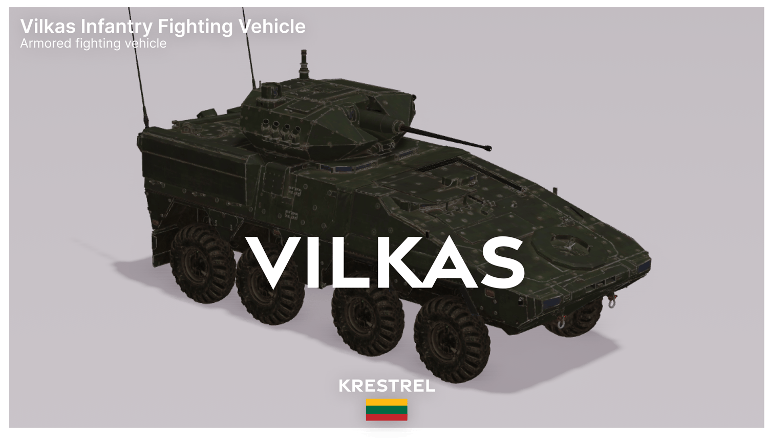 Dominate the battlefield with the Vilkas Infantry Fighting Vehicle. Designed to deliver superior mobility, protection, and firepower, this armored vehicle is perfect for modern military scenarios. Its sleek yet rugged design ensures it stands out while fitting seamlessly into any tactical or combat environment.