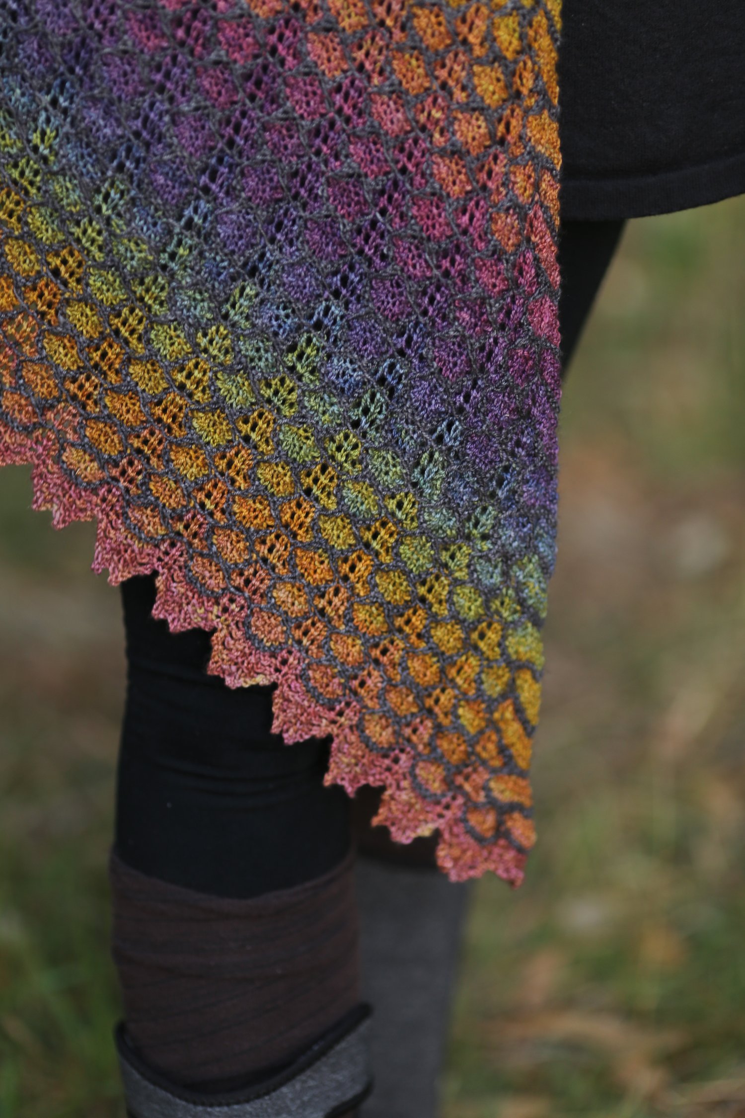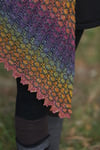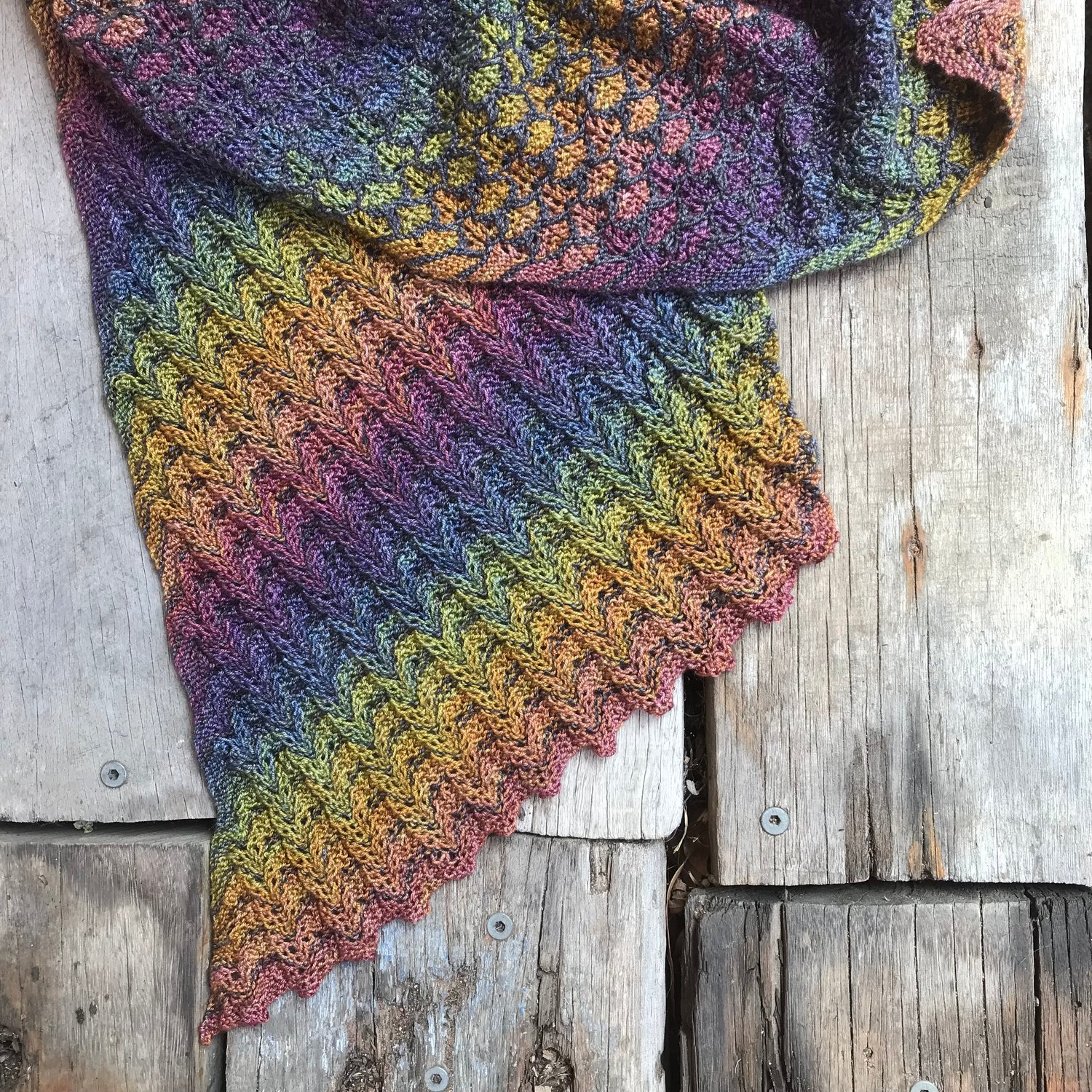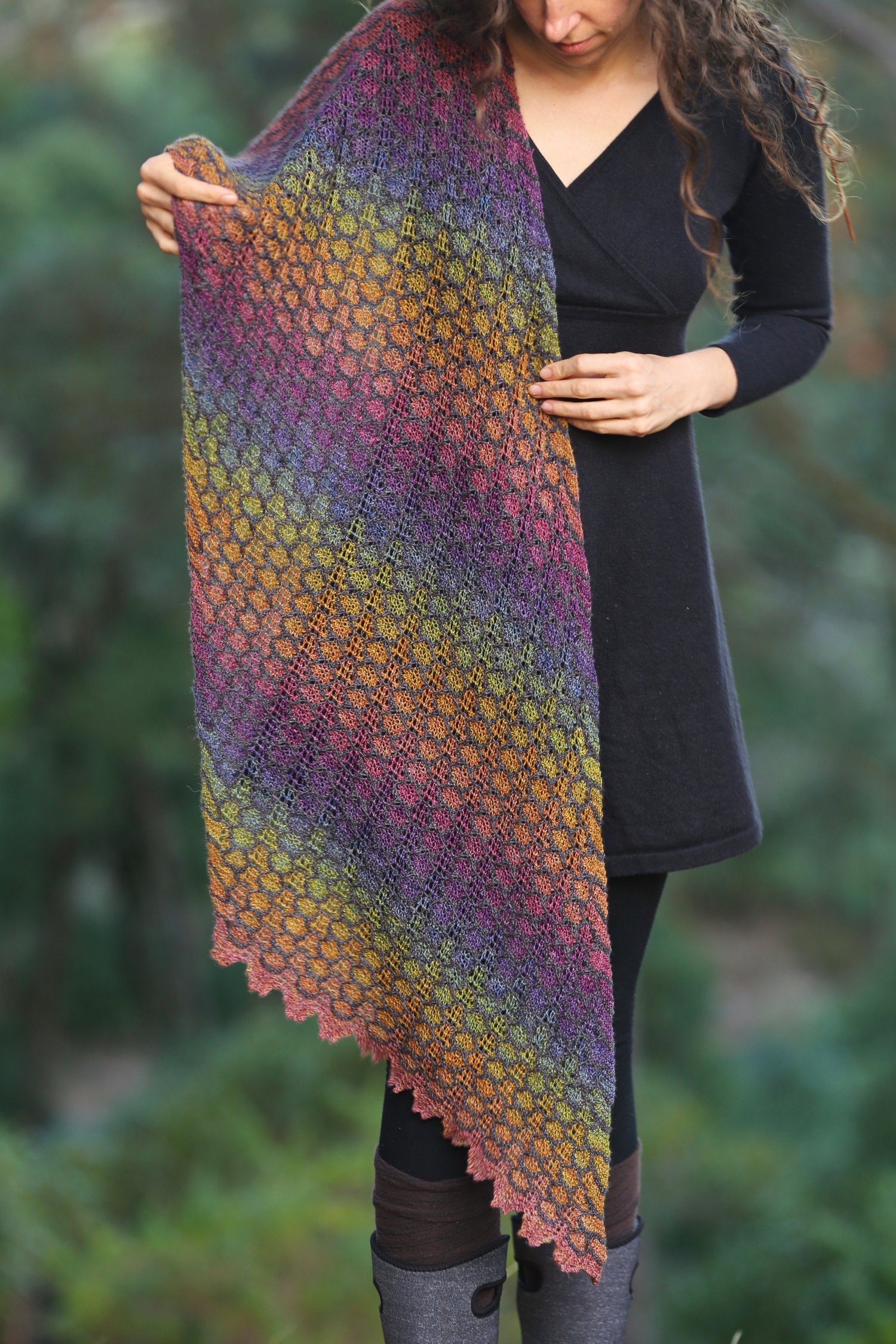 Plan Bee is a long parallelogram or slanty rectangle designed for playing with colour & bias. The design can be made as a scarf or widened into a stole. The pattern is worked in stripes, alternating between wide stripes of stockinette lace and overlaid with garter lines with lifted stitches.