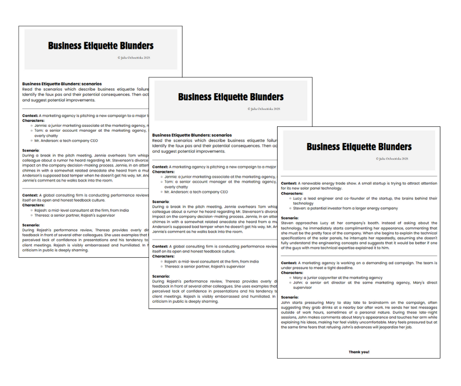 A short worksheet which tackles the topic of business etiquette by adressing several bad professional practices ranging from cultural insensitivity to breaching professional boundaries.