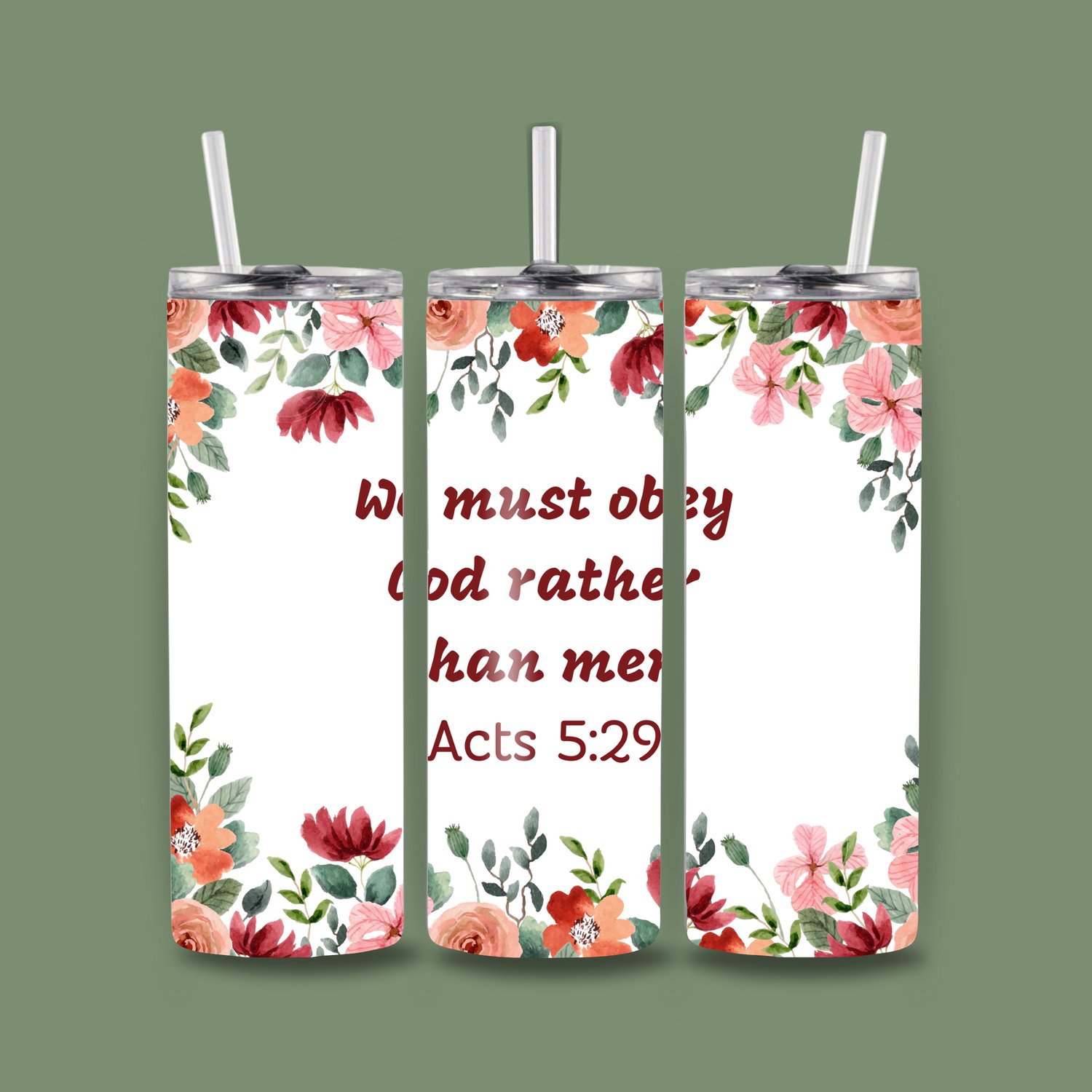 Stand boldly in faith with this beautiful 20oz Acts 5:29 Christian Tumbler, wrapped in delicate watercolor florals in shades of red, peach, pink, and green. Featuring the powerful scripture “We must obey God rather than men — Acts 5:29,” this tumbler is perfect for women who love floral beauty with a meaningful message.