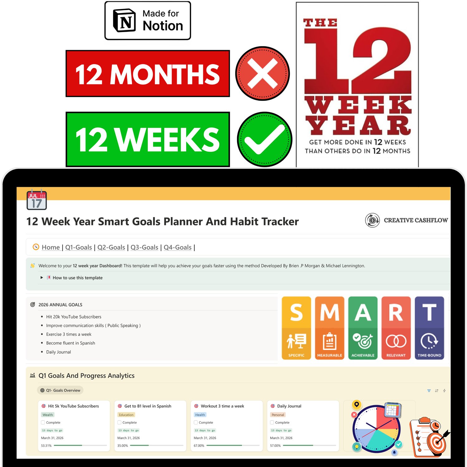 Transform your annual goals into clear, actionable steps with the 12 Week Year Smart Goals Planner And Habit Notion Template.