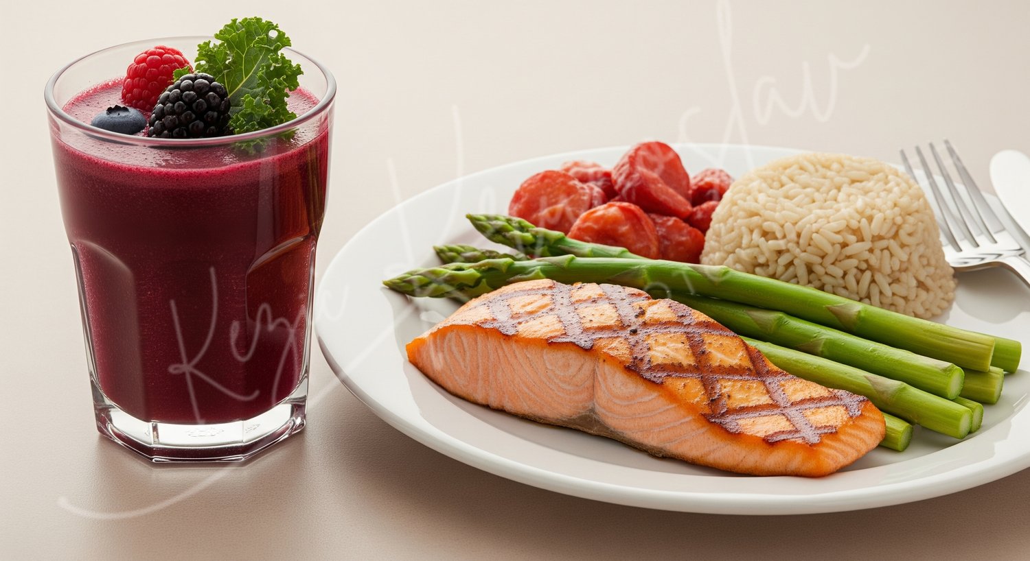 Grilled salmon with asparagus, brown rice, and strawberries next to a dark berry smoothie, bright professional food photography.