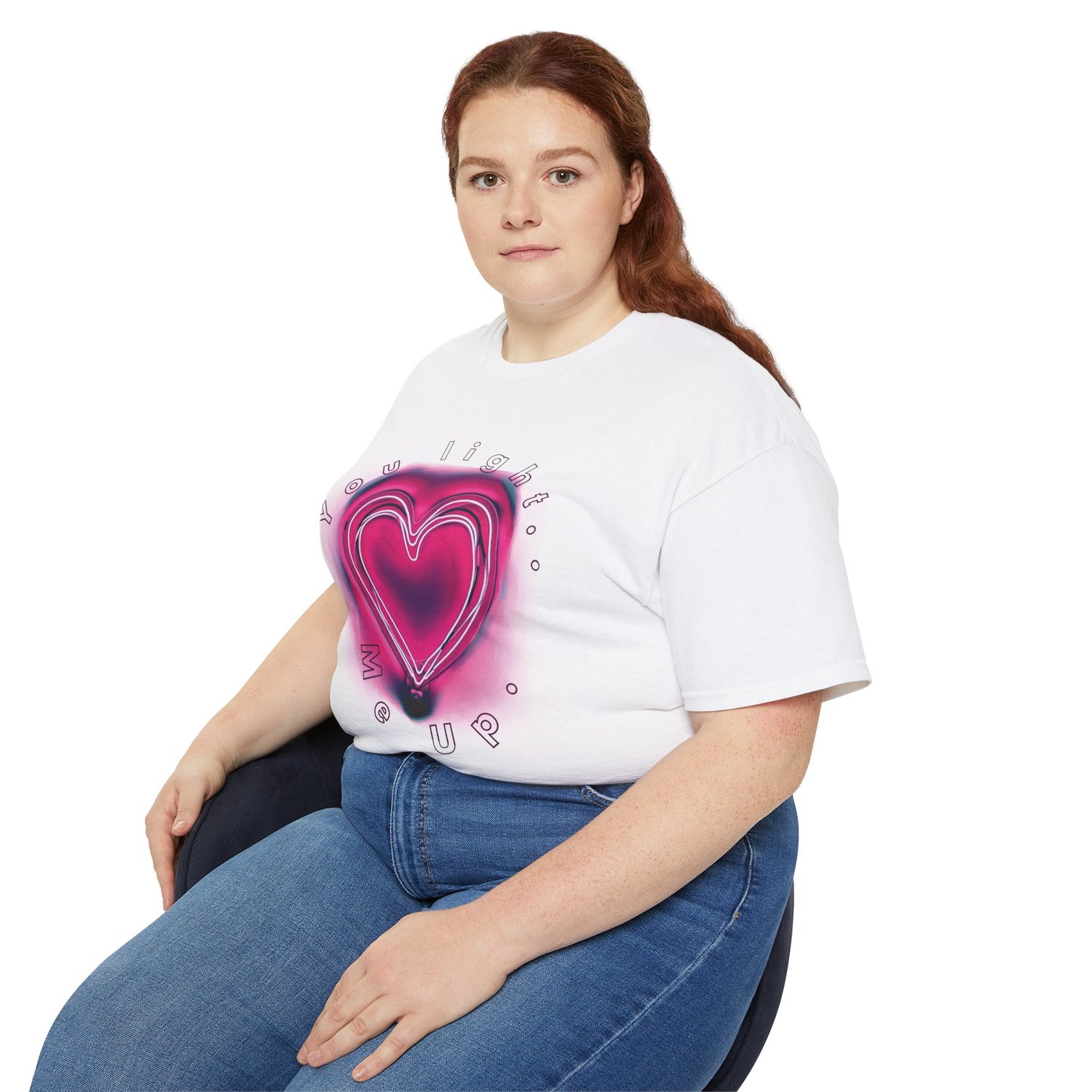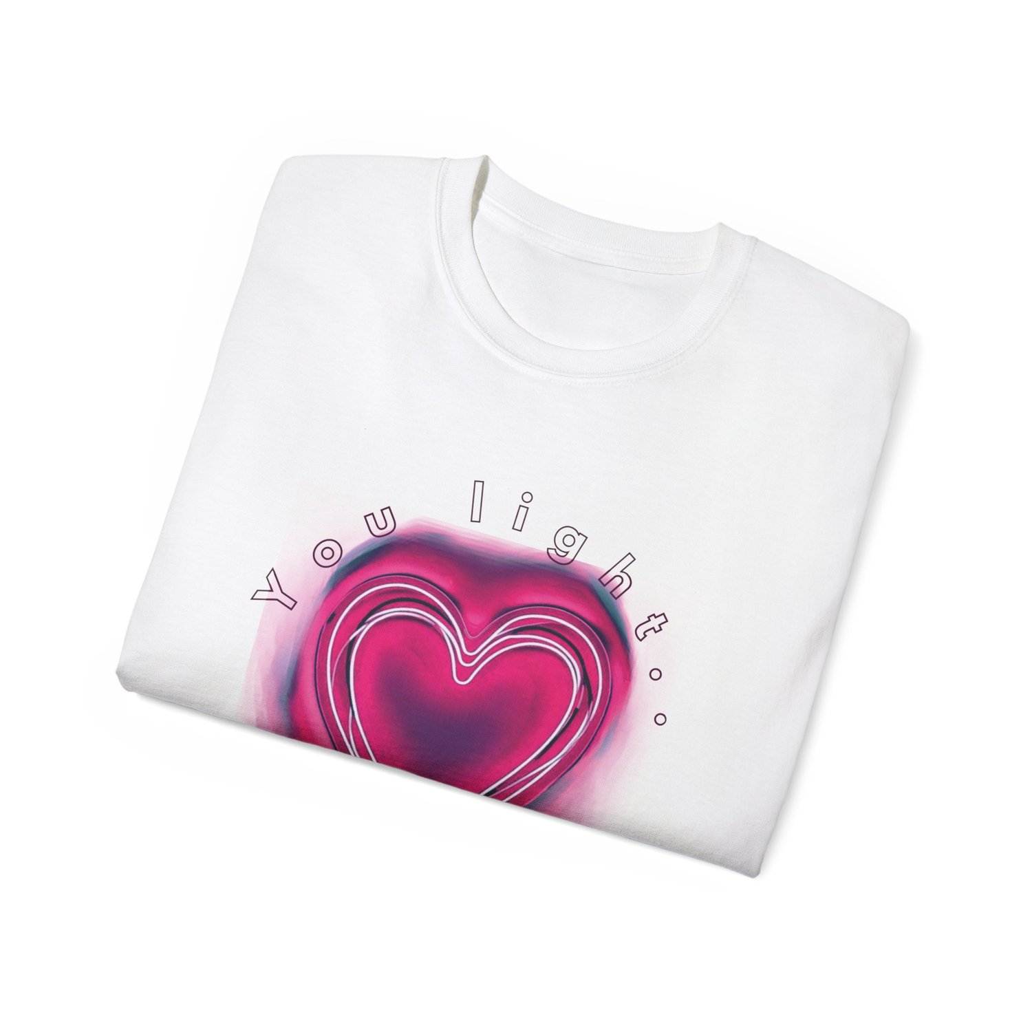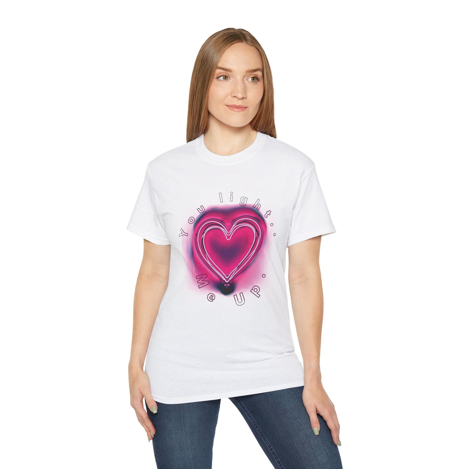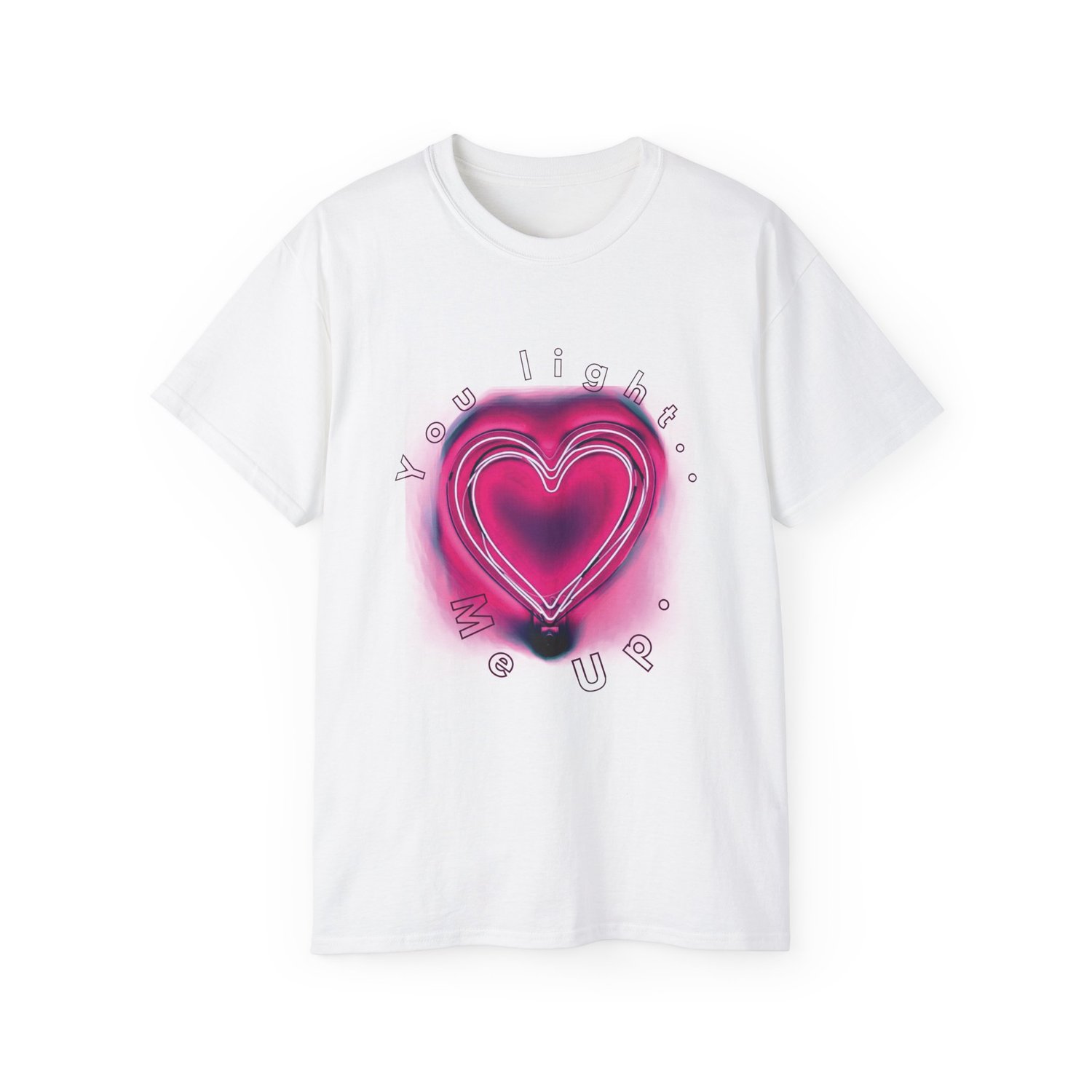 A soft and comfortable unisex tee featuring a pink heart-shaped light bulb with the quote “you light me up”. This tee exudes a warm and loving vibe, making it a perfect gift for loved ones on occasions like birthdays, anniversaries, or Valentine's Day. Suitable for adults looking for a versatile and stylish wardrobe addition.