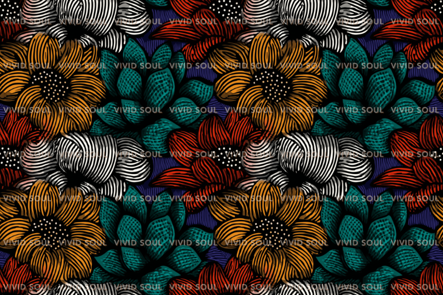 The Soul Petals Collection is a vibrant 12-piece seamless digital pattern bundle inspired by the spirit of Ankara textiles and rooted in the soul of Afrocentric artistry. Each design bursts with intricate floral forms, bold linework, and rhythmic color palettes that channel tradition, modernity, and pure creative fire.